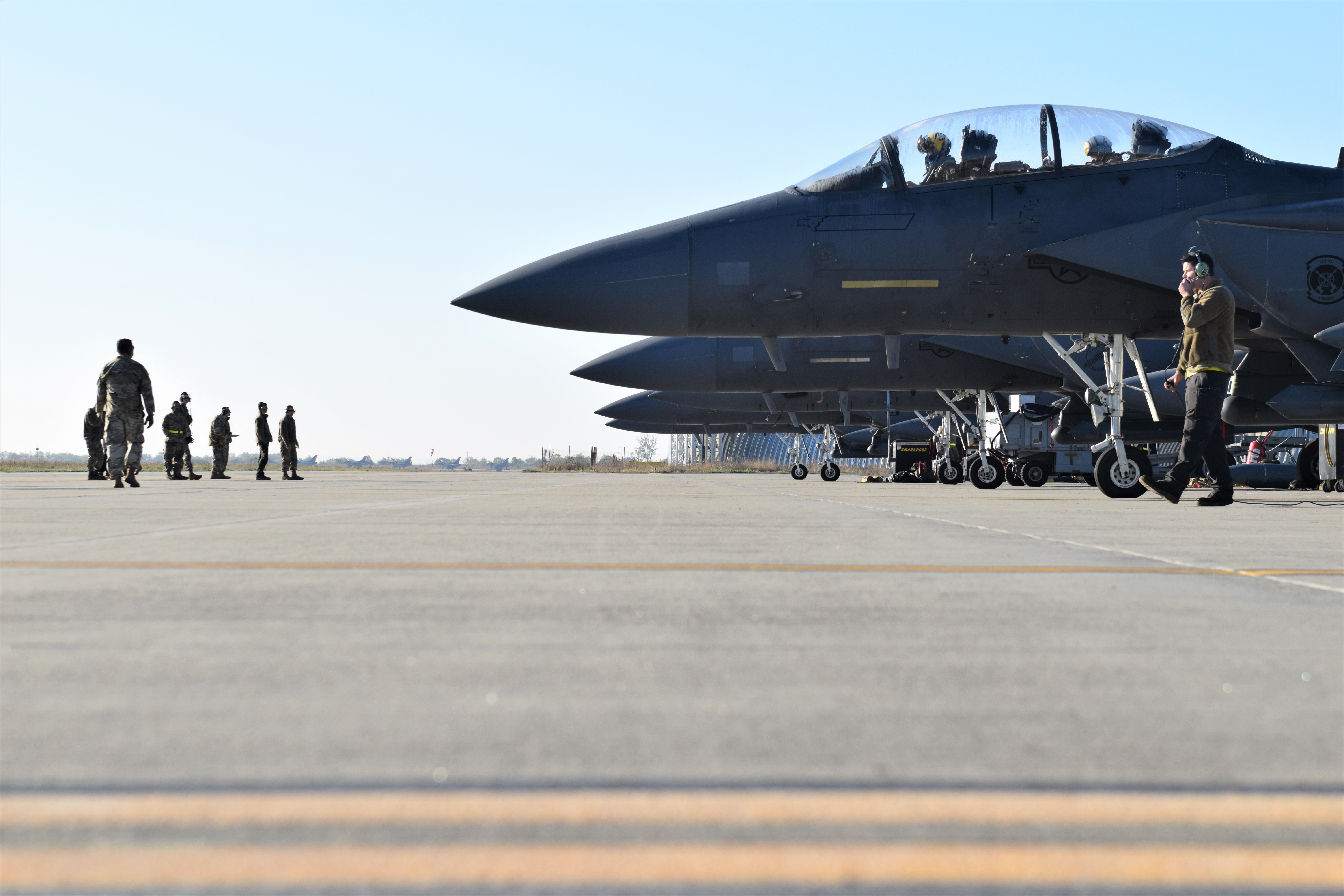U.S. Airmen from the 336th Fighter Squadron, 4th Fighter Wing, Seymour Johnson Air Force Base, North Carolina, prepare their F-15E Strike Eagles for a series of integrated training sorties during operation Castle Forge alongside F-16 aircraft from the Romanian Air Force’s 53rd Fighter Squadron, Borcea 86th Air Base, Romania, Oct. 21, 2021. Castle Forge is a U.S. Air Forces Europe-Air Forces Africa-led, joint, multi-national operation. It provides a dynamic, partnership-focused training environment that raises the U.S. commitment to collective defense in the Black Sea region while enhancing interoperability alongside NATO allies (U.S. Air Force photo by Capt. Andrew Layton).