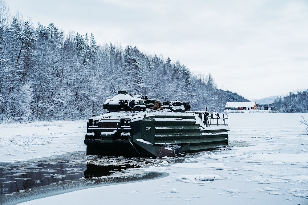 U.S. Marines with Marine Rotational Force-Europe 21.1, Marine Forces Europe and Africa, conduct a safety of use memorandum (SOUM) on an assault amphibious vehicle in preparation for Exercise Reindeer II, Reindeer I, and Joint Viking in Setermoen, Norway, Nov. 19, 2020. The SOUM test assessed the watertight integrity of AAV’s hull on a submerged ramp and is part of a continuing effort to ensure the equipment is safe. (U.S. Marine Corps photo by Cpl. William Chockey)