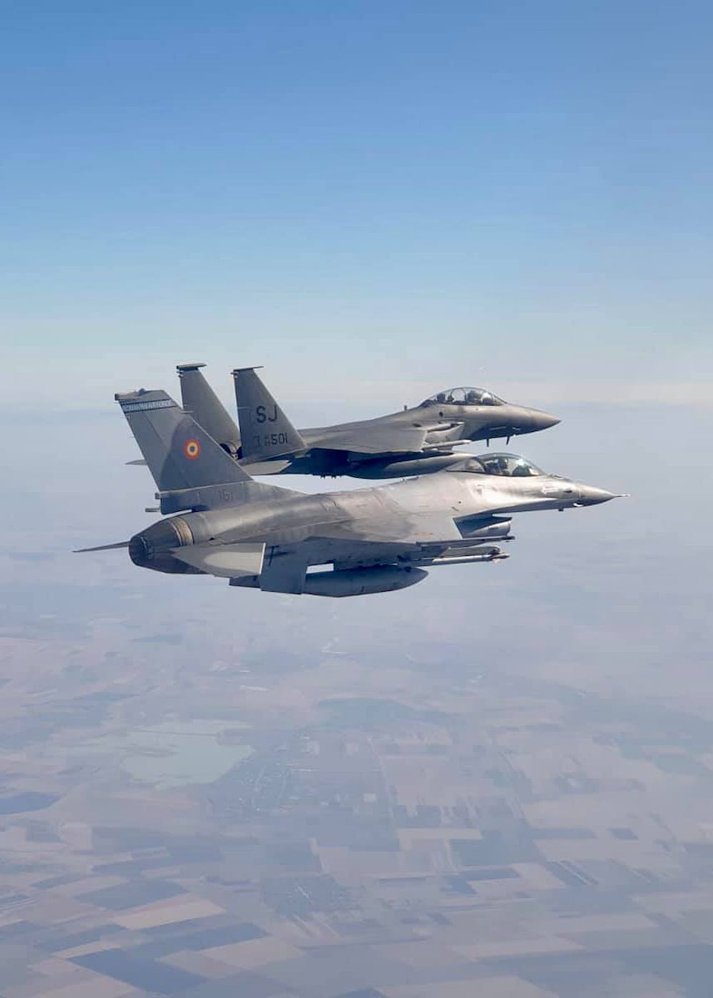 A Romanian F-16 Fighting Falcon from the 53rd Fighter Squadron, Borcea 86th Air Base, Romania, flies in formation with a U.S. F-15E Strike Eagle from the 336th Fighter Squadron, 4th Fighter Wing, Seymour Johnson Air Force Base, North Carolina, during operation Castle Forge, Oct. 20, 2021. Castle Forge is a U.S. Air Forces Europe-Air Forces Africa-led, joint, multi-national operation. It provides a dynamic, partnership-focused training environment that raises the U.S. commitment to collective defense in the Black Sea region while enhancing interoperability alongside NATO allies (Courtesy photo by Romanian Air Force).