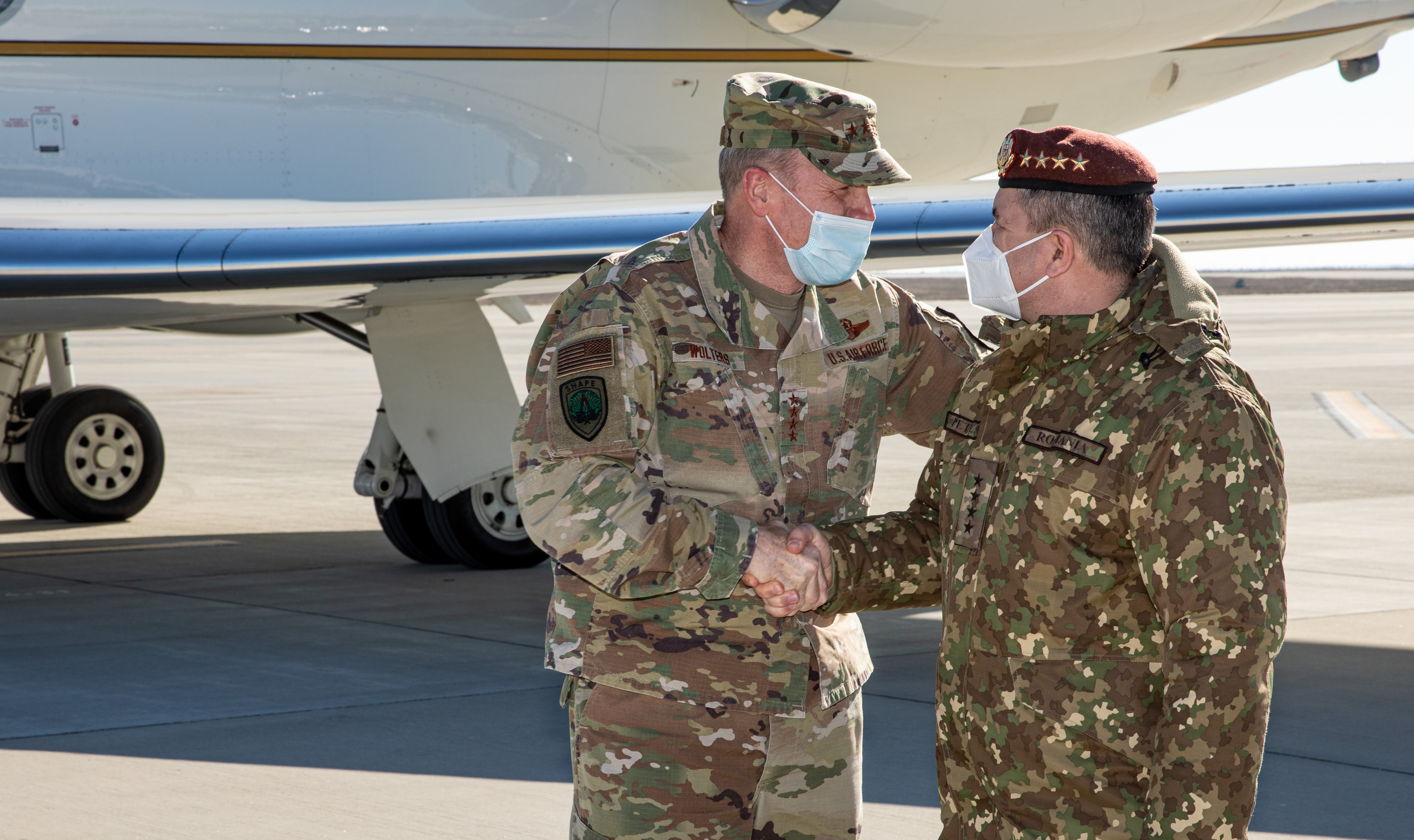 U.S. Air Force Gen. Tod D. Wolters, NATO Supreme Allied commander, greets Romanian Chief of Defense Gen. Daniel Petrescu during a visit to Mihail Kogalniceanu Air Base, Romania, Feb. 10, 2022. Enhanced vigilance in Central and Southeastern Europe is a strong reflection of the will, unity and cohesion of the NATO Alliance by demonstrating readiness in multi-national operations. (U.S. Army photo by Spc. Osvaldo Fuentes)