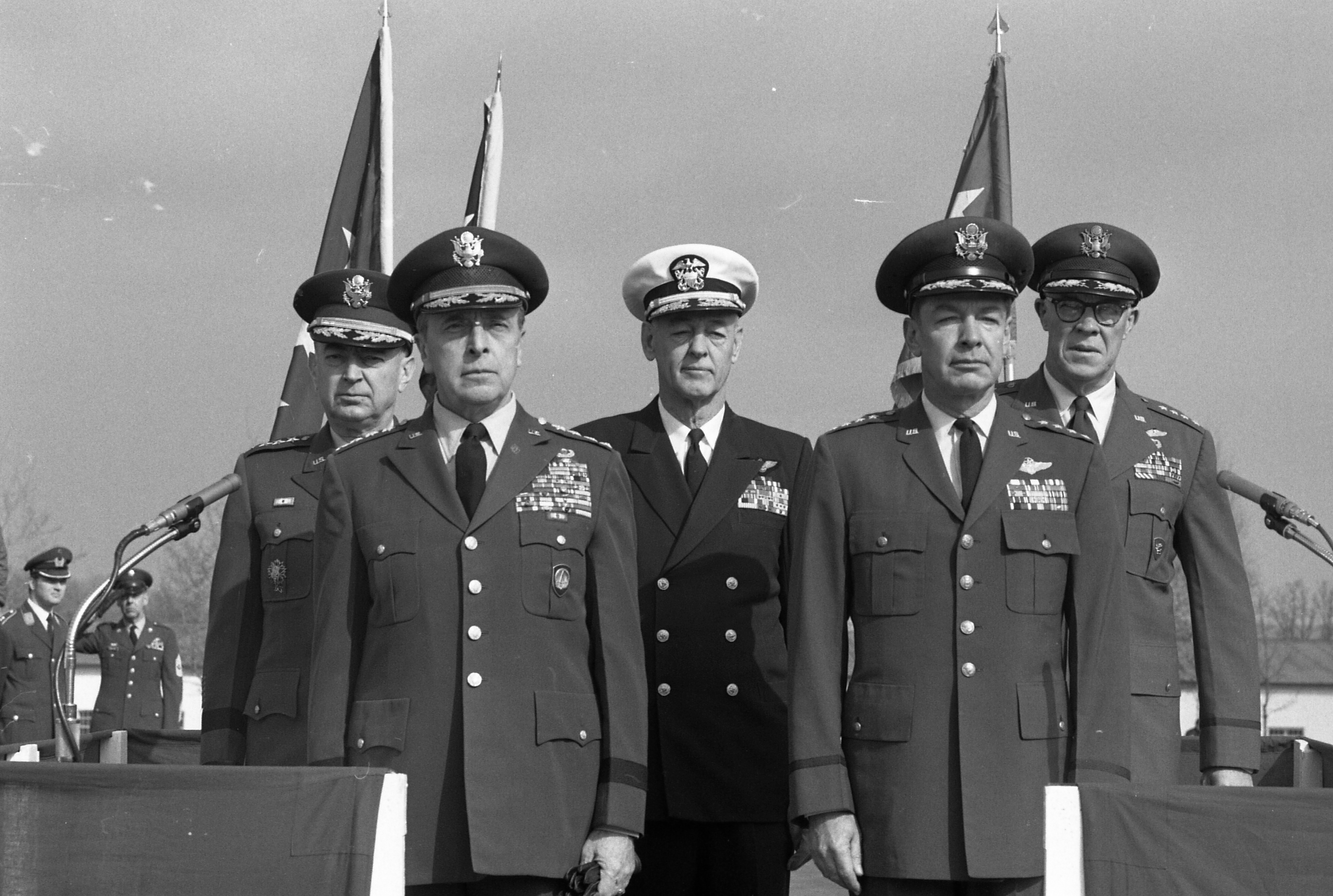 Gen. Lyman Lemnitzer, front left, U.S. European Command commander in chief; Gen. David A. Burchinal, USEUCOM deputy commander-in-chief, front right; and back row, left to right, Gen. Andrew P. O'Meara, Commander in chief of U. S. Army Europe; Adm. John S. Thach, Commander in chief of U.S. Navy Europe; and Gen. Maurice A. Preston, Commander in chief of U.S, Air Forces Europe, review troops at Patch Barracks, the new USEUCOM headquarters. Official arrival ceremonies mark the resumption operations of USEUCOM Headquarters at Patch Barracks in Stuttgart, Germany. EUCOM headquarters moved from Camp des Loges near Paris, France where it had been since 1954 to its new digs in Germany on March 15, 1967. (Courtesy photo by Merle Hunter / ⓒ 1967, 2022 Stars and Stripes, All Rights Reserved.)