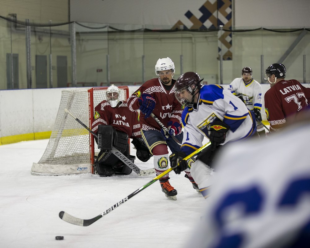 U.S. Air Force Lt. Col. Michael Pierce, assigned to U.S. Special Operations Command Europe, works the puck closer to the Latvian goal as Latvian players attempt to defend it. Military hockey teams from Latvia, Canada and the United States participated in a friendly competition held April 22, 2023, in Valmiera, Latvia. The games were part of the Stronger Together Hockey Exhibition, a series of military hockey events that, through a shared love for hockey, strengthens partnerships and contributes to solidarity and interoperability in deterring aggression along NATO’s eastern flank. (U.S. Army photo by 1st Sgt. Daryl T. Madrid)