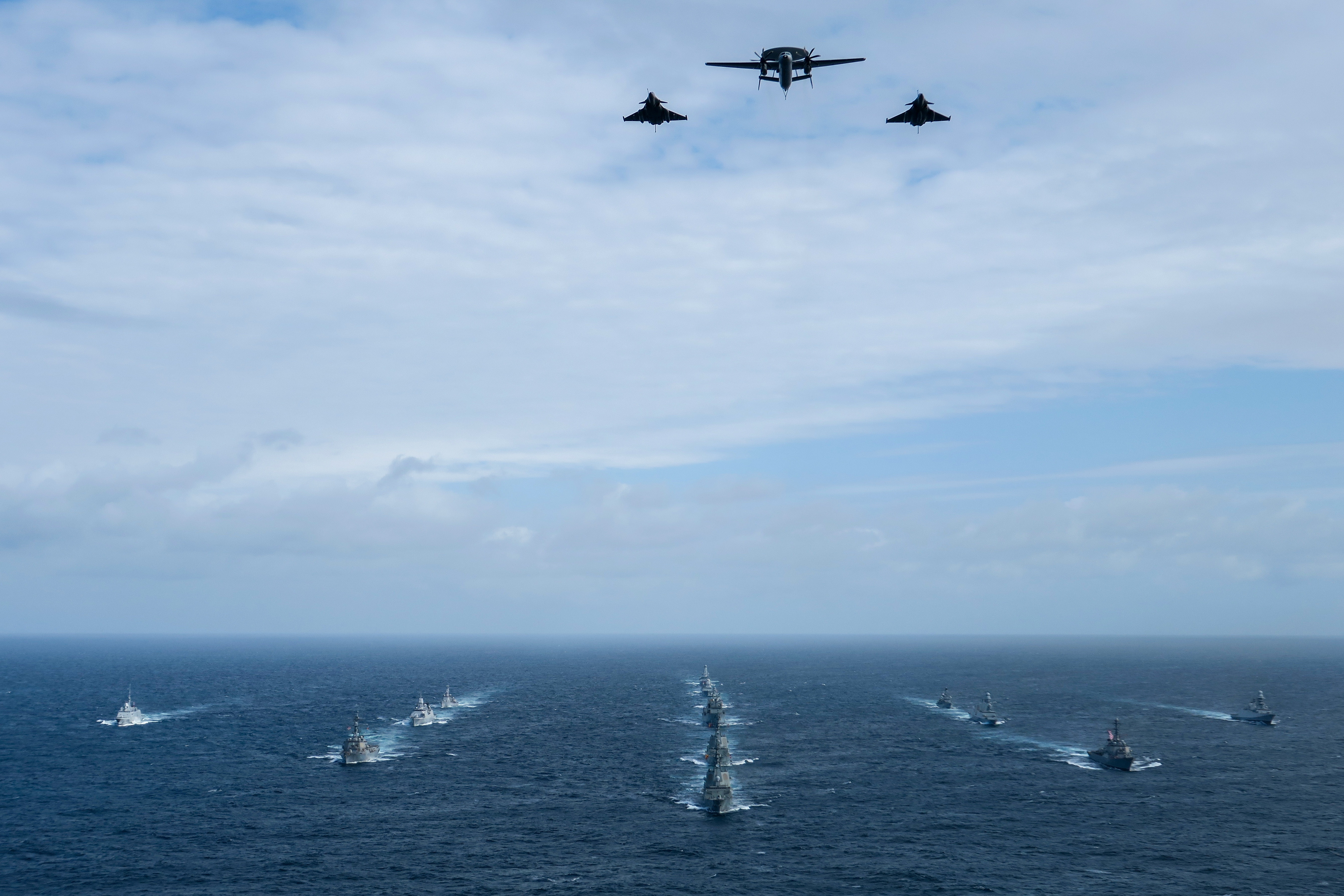 As seen from on board HMS Defender, NATO ships sail in formation below a French Air Force fly-over during Formidable Shield 2023 in the North Atlantic on May 15, 2023. Formidable Shield is a NATO joint exercise with 2023 seeing allied fleets working together in the North Atlantic from the United States, Canada, France, Netherlands, Italy and the UK.