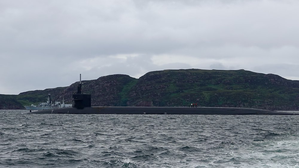 Ohio-class ballistic missile submarine, USS Tennessee (SSBN 734), and the Royal Navy warship HMS Northumberland, travel along the northwest coast of the U.K following a capabilities demonstration July 16, 2023. The USS Tennessee integrated with the Royal Navy for invaluable training experience, which supports regional and global security objectives with highly trained, interoperable forces.