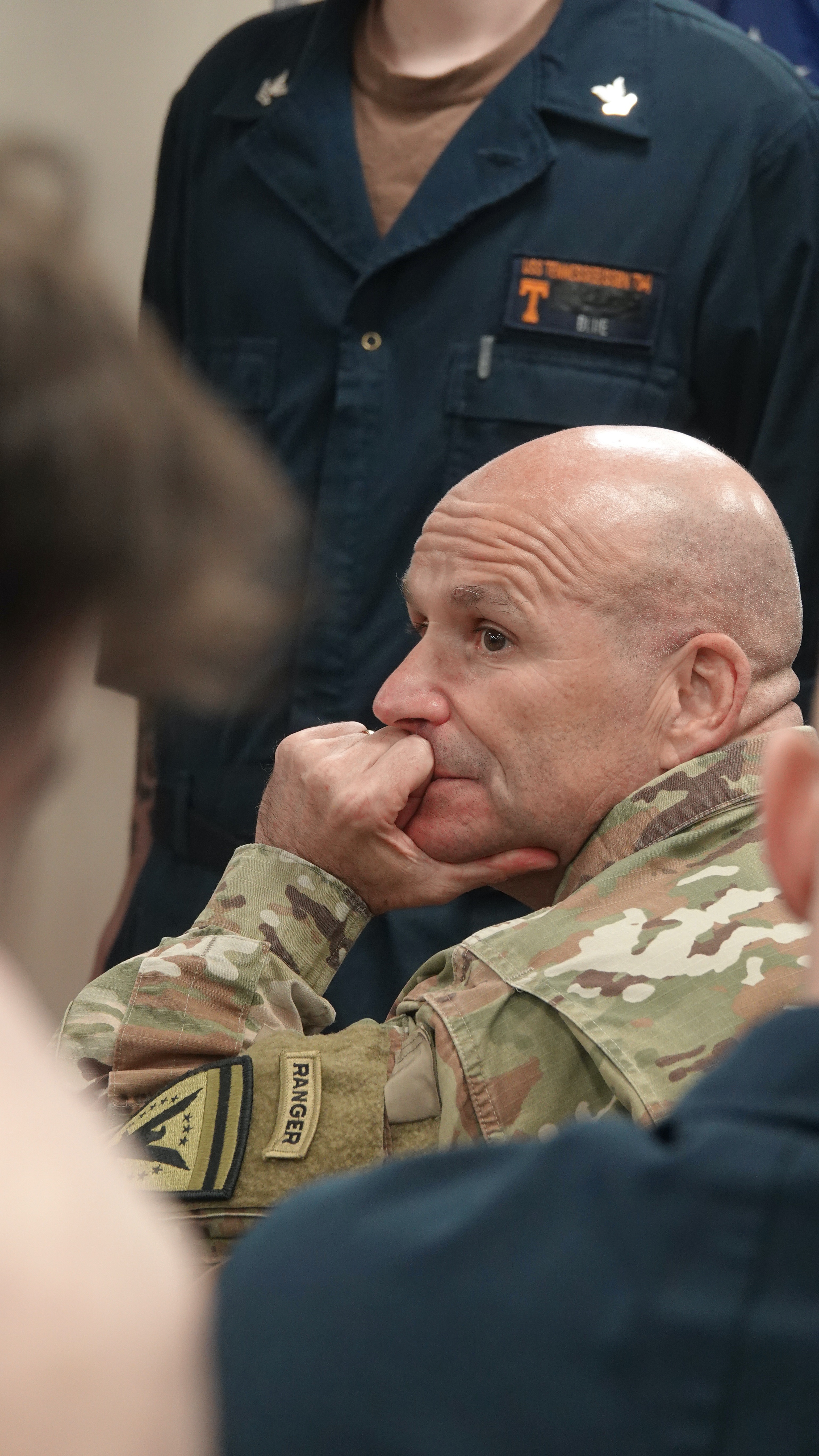 U.S. Army Gen. Christopher G. Cavoli, commander of U.S. European Command, listens in as citations are read for sailors receiving their Submarine Warfare Insignia while aboard the U.S. Navy Ohio-class ballistic missile submarine, USS Tennessee (SSBN 734), off the northwest coast of U.K., July 16, 2023. Cavoli visited the Tennessee at sea where the crew provided a tour and demonstrations of the unit's capabilities.
