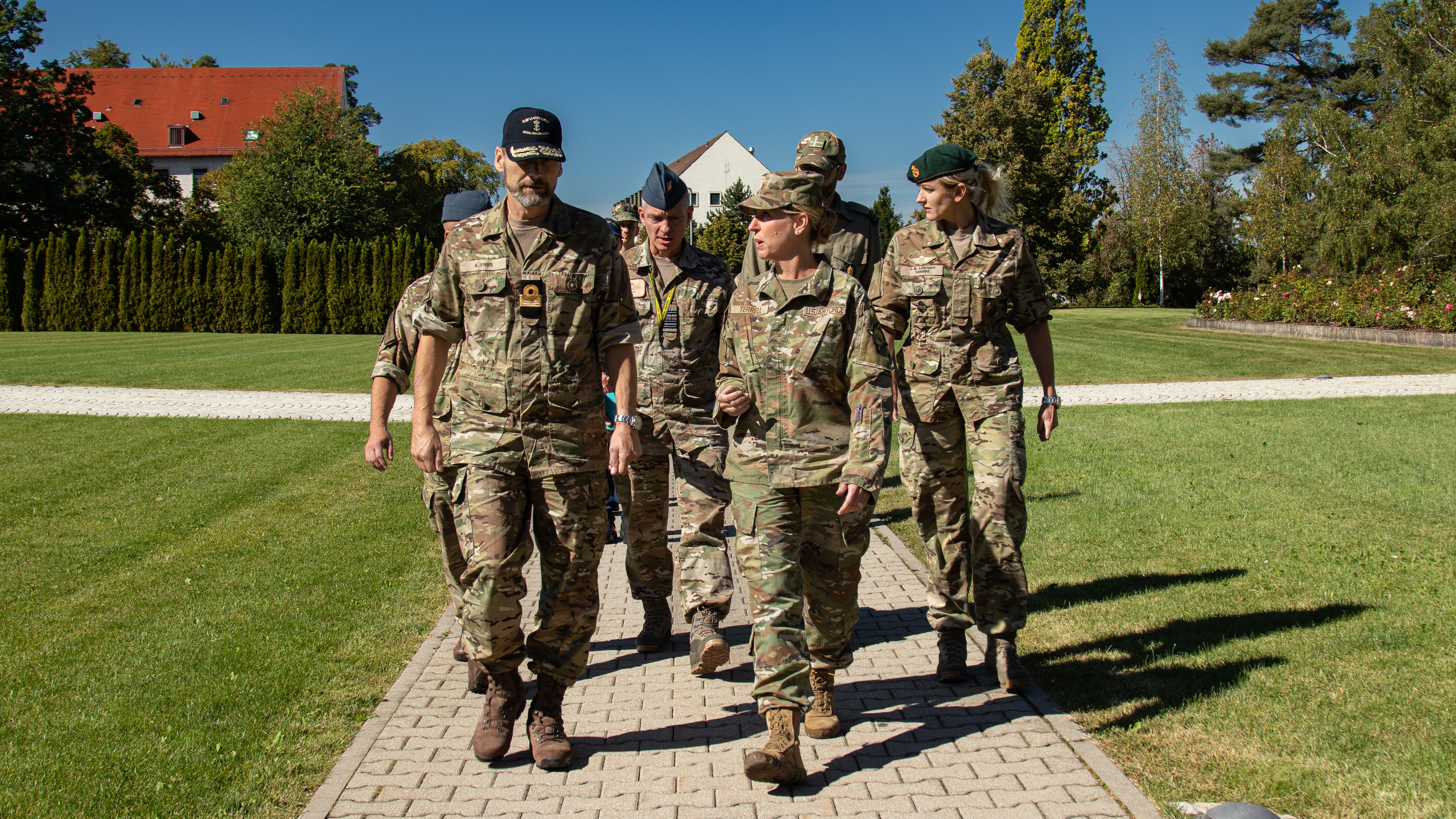 U.S. Air Force Brig. Gen. Bryony Terrell walks Danish military officials across Washington Square at the U.S. European Command headquarters in Stuttgart, Germany, on Sept. 20, 2023. Meeting on the heels of Denmark taking delivery of its first fifth-generation aircraft, the American-produced F-35 Lightning, only underscored the close and enduring military relationships shared by the two nations.
