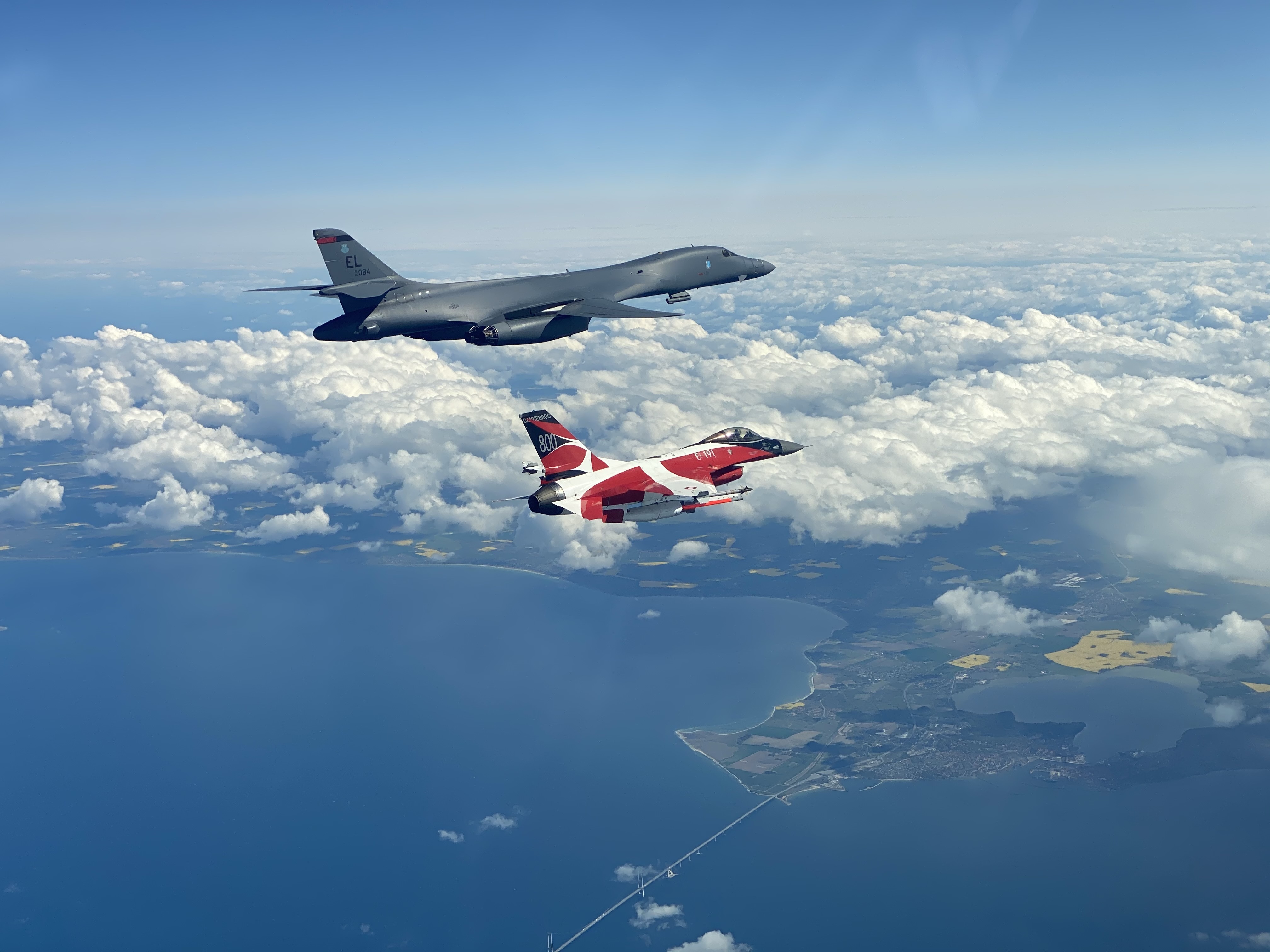 A B-1B Lancer flies with a Danish F-16 during a training mission for Bomber Task Force Europe on May 5, 2020.