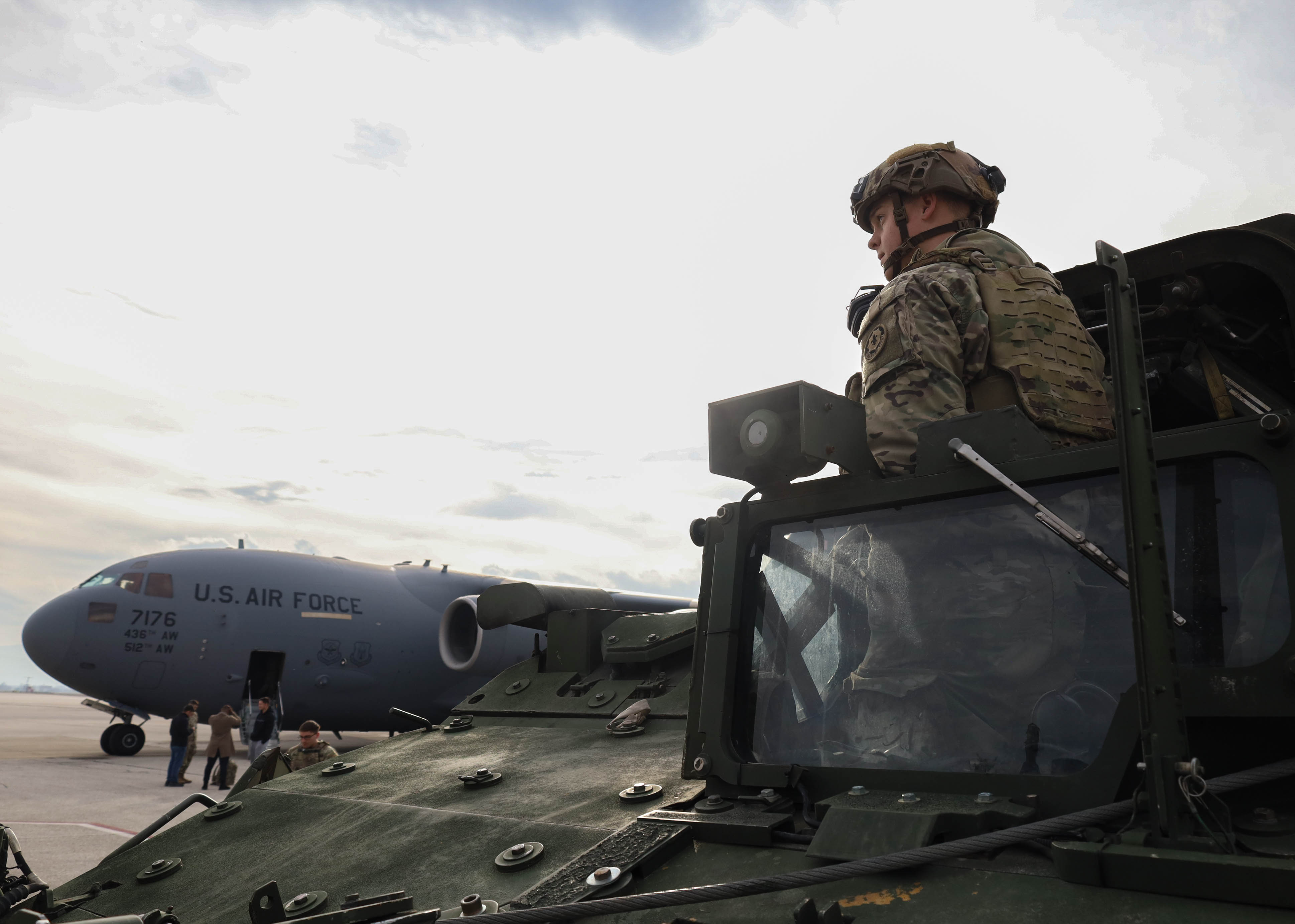U.S. Army Spc. Kyle Mickel, a mounted stryker cavalry Soldier assigned to 2nd Squadron, 2nd Cavalry Regiment, V Corps, observes the airfield from an armored personnel vehicle, infantry fighting vehicle, Stryker near a U.S. Air Force C-17 Globemaster aircraft during exercise Brave Partner 23 at Skopje International Airport, Republic of North Macedonia, Dec. 1, 2023. Brave Partner is a U.S. Army Europe and Africa scheduled, directed, and led short notice action planning exercise, which includes live-fire training and is designed to demonstrate USAREUR-AF’s operational reach, validate U.S. investments in the Republic of North Macedonia, and increase readiness. (U.S. Army photo by Spc. Devin Klecan)