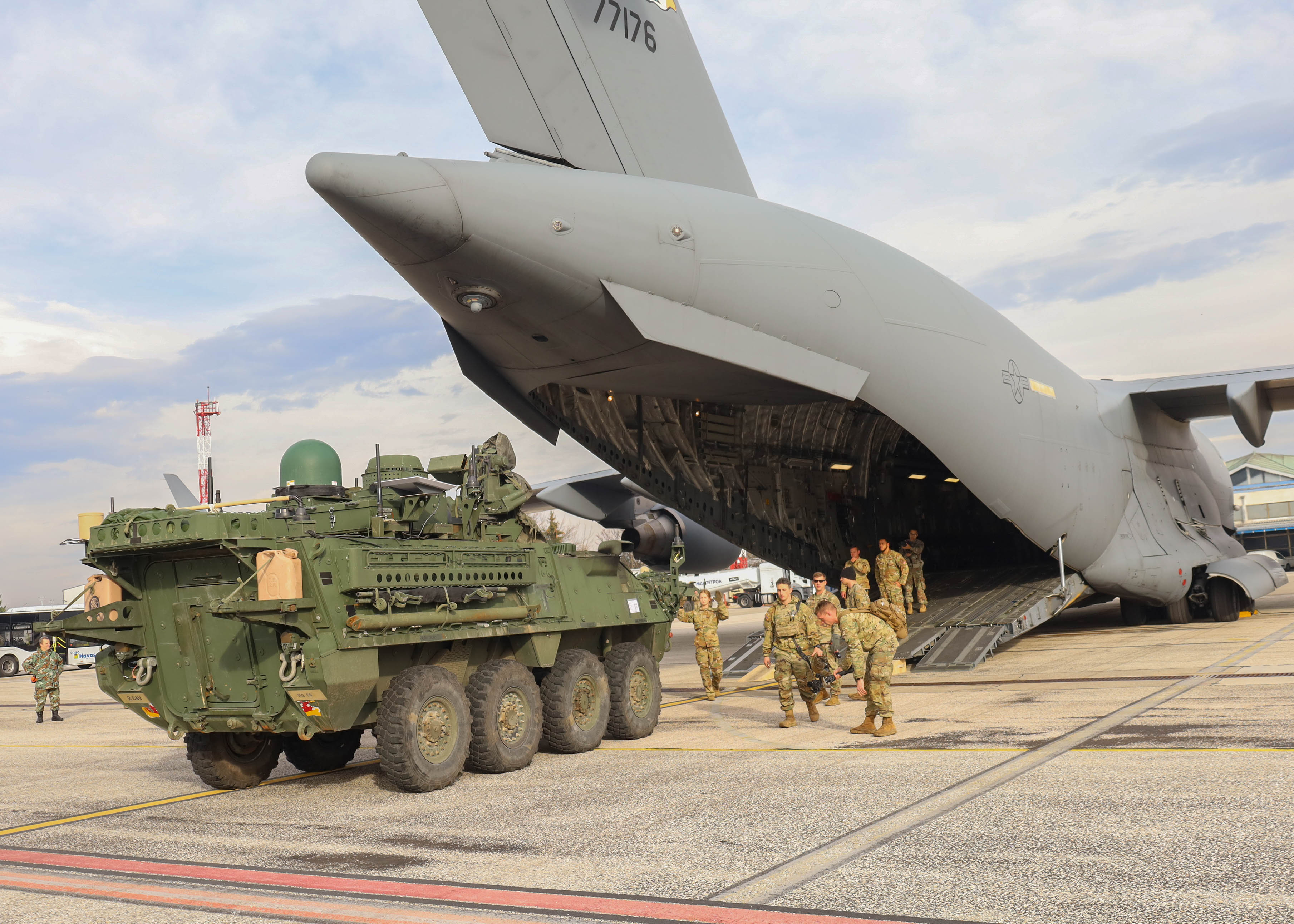 A U.S. Army armored personnel vehicle, infantry fighting vehicle, Stryker belonging to the 2nd Squadron, 2nd Cavalry Regiment, V Corps, moves out of a U.S. Air Force C-17 Globemaster aircraft during exercise Brave Partner 23 at Skopje International Airport, Republic of North Macedonia, Dec. 1, 2023. Brave Partner is a U.S. Army Europe and Africa scheduled, directed, and led short notice action planning exercise, which includes live-fire training and is designed to demonstrate USAREUR-AF’s operational reach, validate U.S. investments in the Republic of North Macedonia, and increase readiness. (U.S. Army photo by Spc. Devin Klecan)
