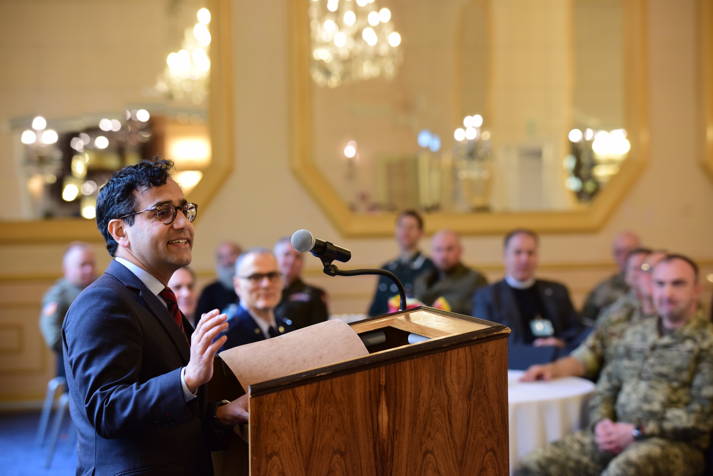 Rehman Chishti, a British member of parliament and former prime minister’s special envoy for freedom of religion or belief, delivers the keynote address for the the International Military Chiefs of Chaplains Conference Feb. 8, 2024, at U.S. European Command headquarters in Stuttgart, Germany. Sixty-five military chaplains and special guests from 13 NATO Ally and partner nations attended the conference, held Feb. 6-8. During the event, participants shared information, identified training needs and areas of cooperation, and updated future engagement plans. (U.S. Army photo by Chuck Prichard)