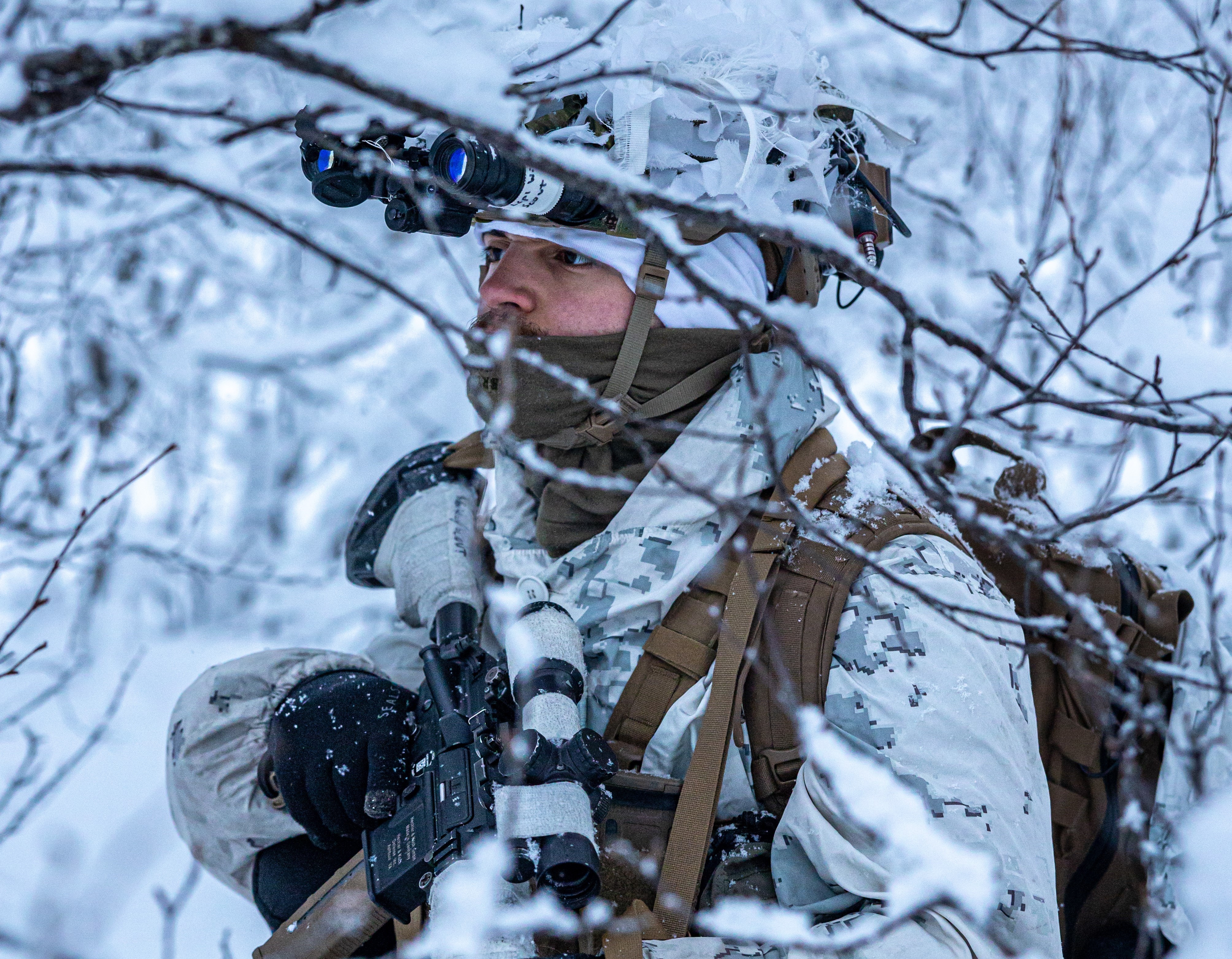 A U.S. Marine with 1st Battalion, 2d Marine Regiment, stands watch during a reconnaissance mission to display interoperability with allies and partner nations prior to Nordic Response 24 in Setermoen, Norway, Feb. 7, 2024. U.S. Marines, in collaboration with NATO allies and partners, gear up for the Nordic Response 24—a biennial NATO training exercise designed to advance arctic security, boost global readiness, and promote interoperability among U.S. Forces, Allied, and partner forces. (U.S. Marine Corps photo by Lance. Cpl. Christian Salazar)