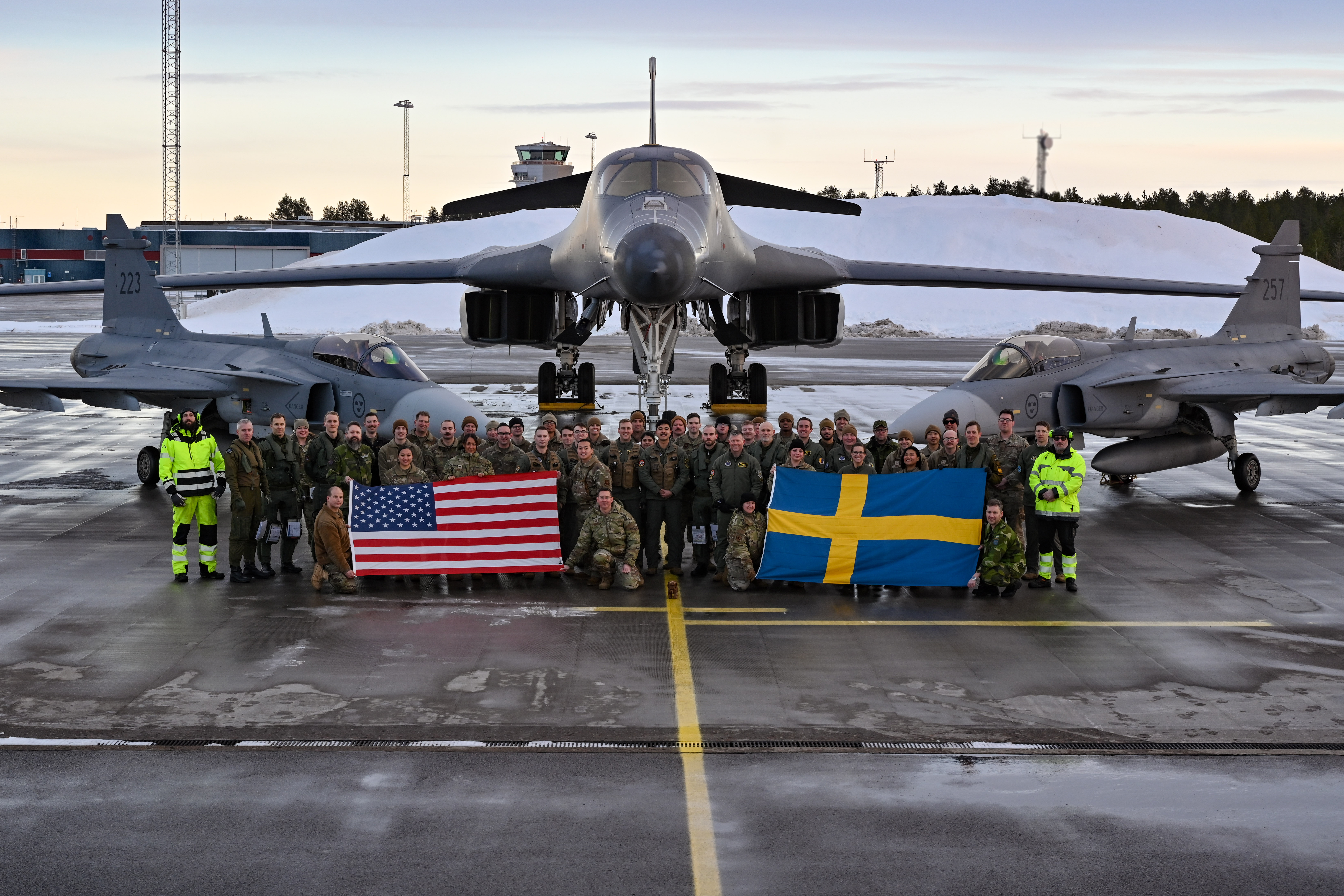 U.S. Air Force Airmen assigned to the 28th Bomb Wing, Ellsworth Air Force Base, South Dakota, pose for a group photo alongside Swedish military personnel in front of a B-1B Lancer and two Saab JAS 39 Gripens at Luleå-Kallax Air Base, Sweden, Feb. 26, 2024, during Bomber Task Force 24-2. These BTF missions are representative of the U.S.' extended deterrent commitment to its Allies and partners and enhance regional security. BTF operations provide U.S. leaders with strategic options to assure Allies and partners, while deterring potential adversary aggression across the globe. (U.S. Air Force photo by Staff Sgt. Jake Jacobsen)