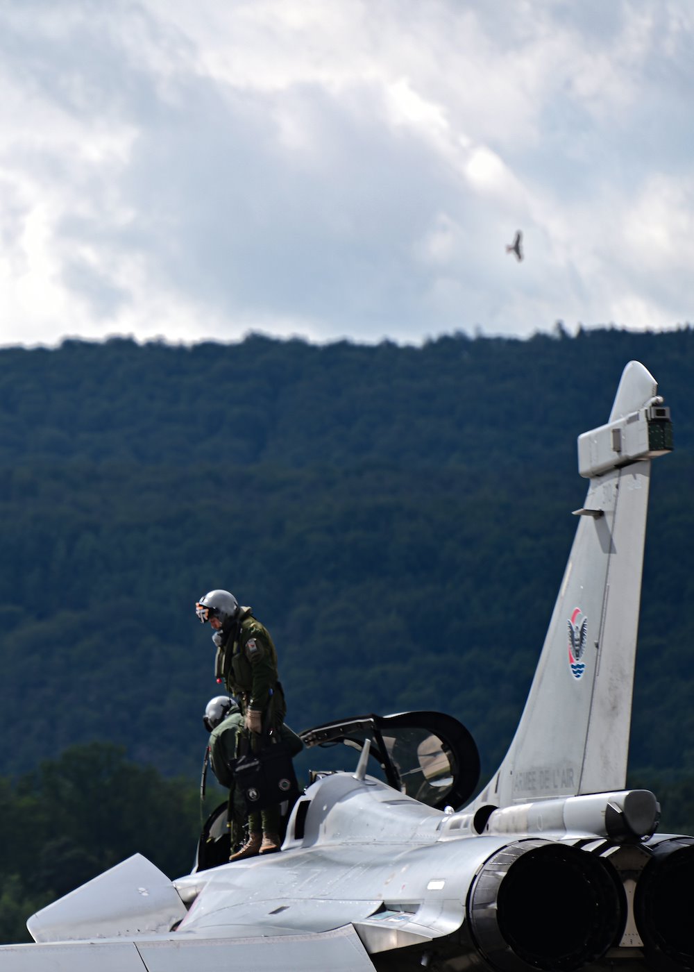 Pilots exit a French Air Force Dassault Rafale after parking on the flight line at Ramstein Air Base, Germany, June 6, 2024. The Rafale was an integral part of a basic fighter maneuvers exercise at the base which boasted a total of 37 aircraft, comprising both fourth and fifth-generation fighter jets.