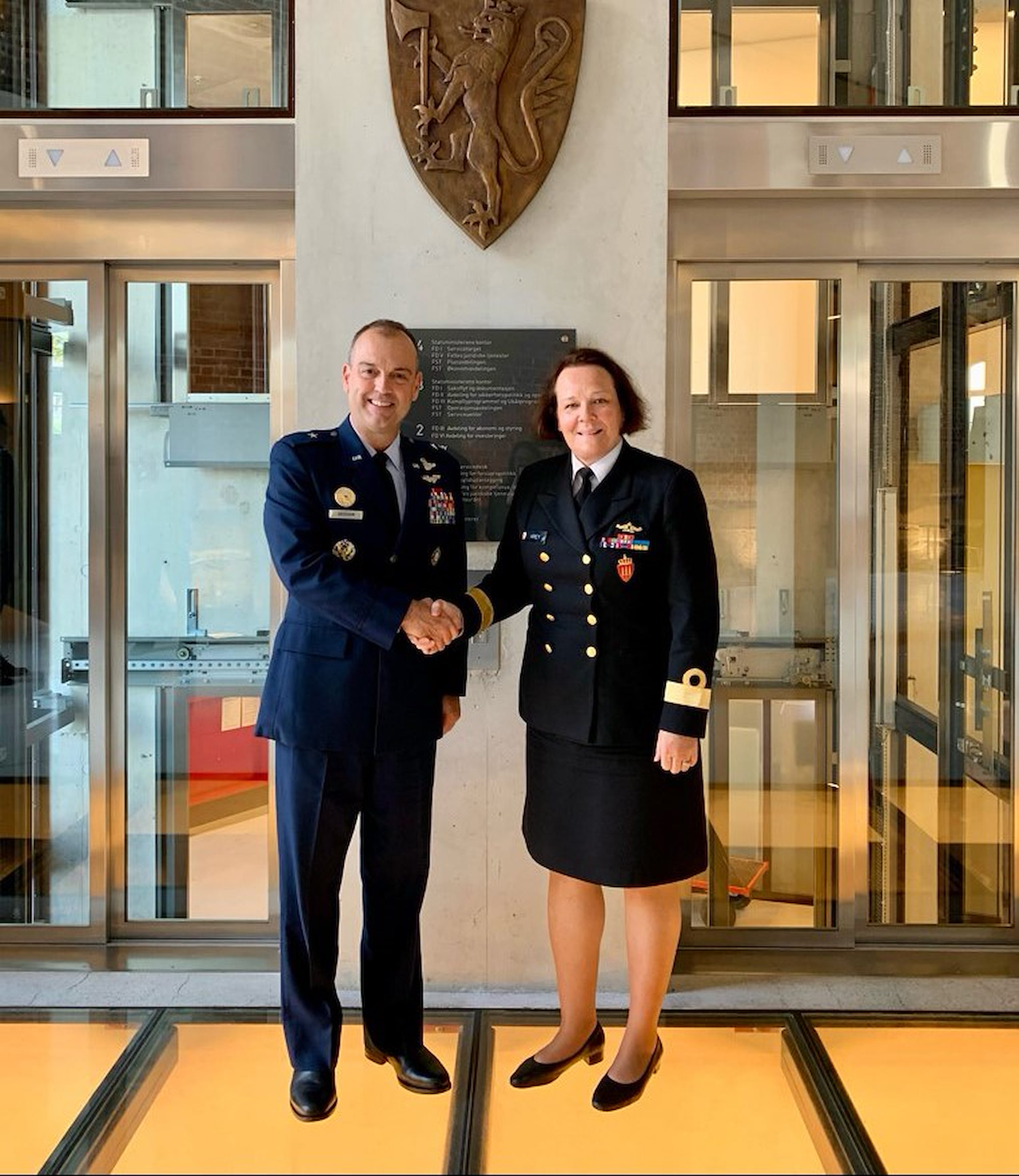 Norwegian Royal Navy Rear Adm. Solveig Krey, Norwegian Defence Staff's chief of operations, and co-chair of the Arctic Security Forces Roundtable, shakes hands with her counterpart, Brig. Gen. Edward Vaughan, the U.S. European Command deputy director for security cooperation, policy, partnering and space. (USEUCOM photo by CPT Sarah Kramer)