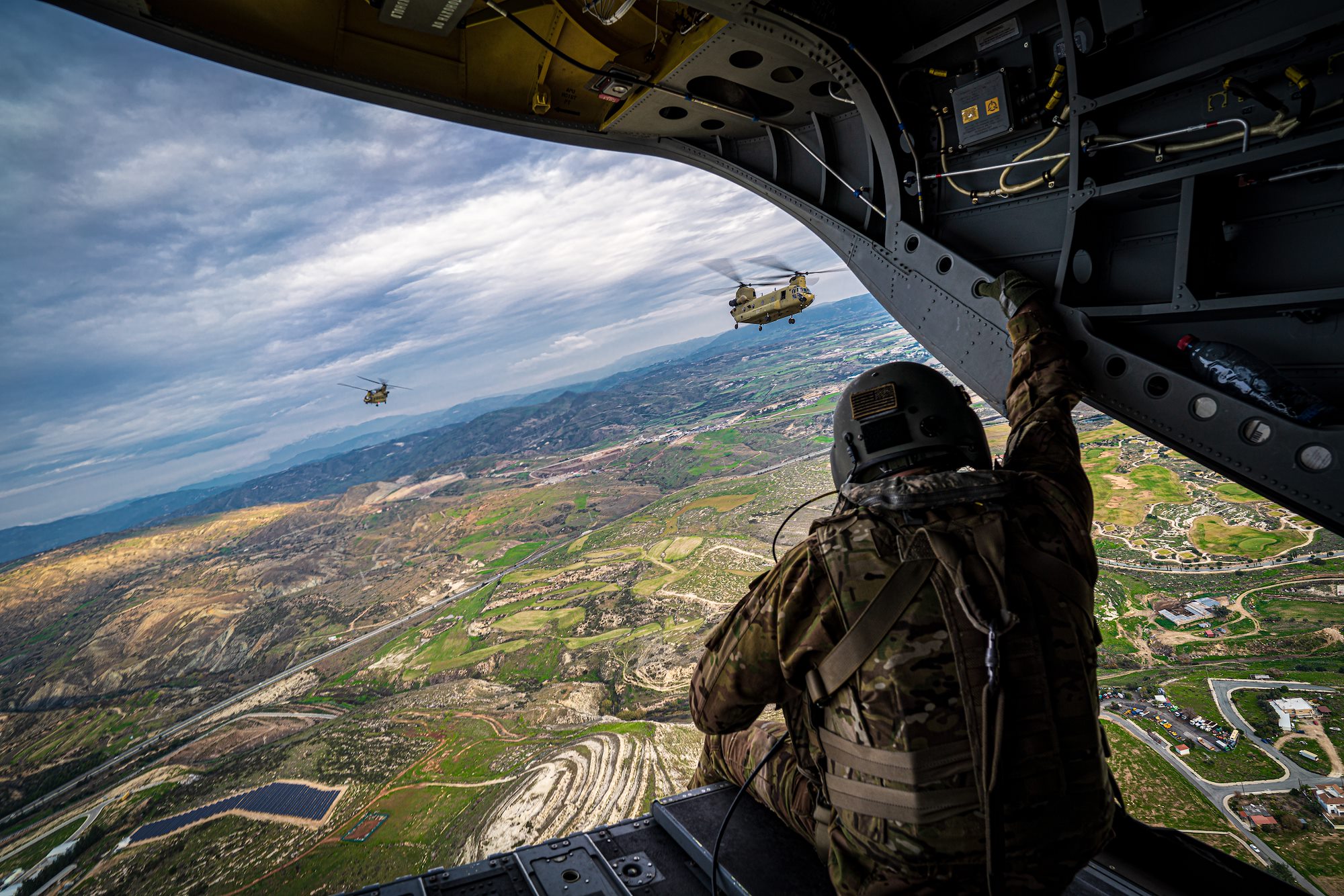 CH-47 Chinook flight engineer Sgt. Wesley Deardurff, assigned to B Co “Big Windy,” 1-214th General Support Aviation Battalion, enjoys the view during a training flight over the island of Cyprus on Jan. 15, 2020.
