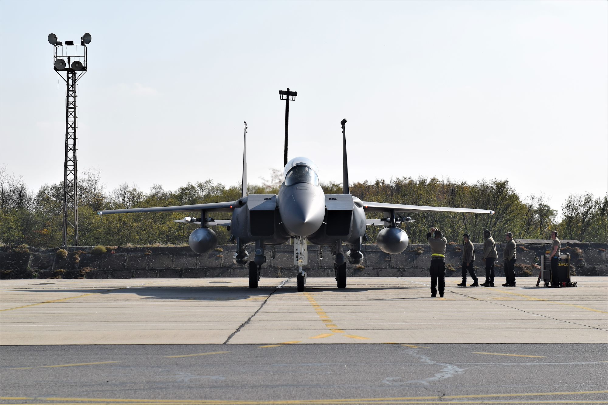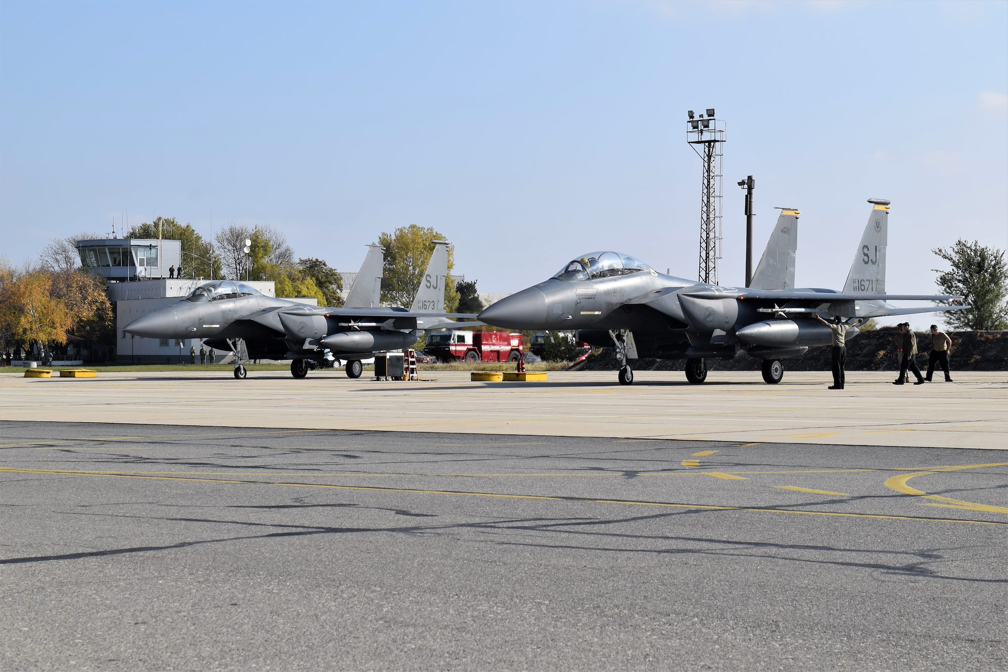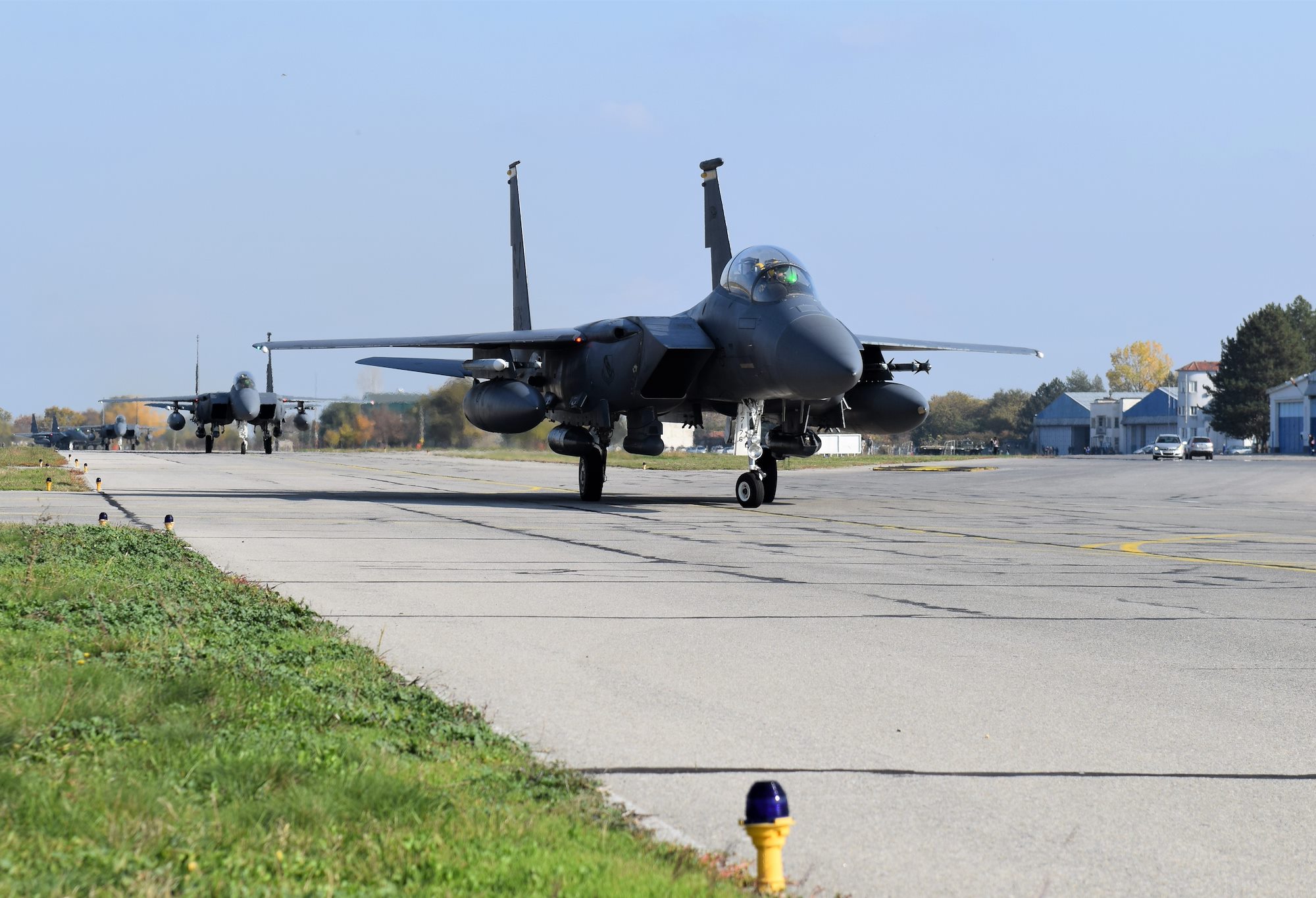 U.S. F-15E Strike Eagle aircraft from the 336th Fighter Squadron, 4th Fighter Wing, Seymour Johnson Air Force Base, North Carolina, arrive at Graf Ignatievo Air Base, Bulgaria, Nov. 1, 2021, in support of operation Castle Forge, a U.S. Air Forces Europe-Air Forces Africa-led joint, multinational training event. The Strike Eagles will spend the next several days training at the Bulgarian Air Force facility, continuing Castle Forge’s objective of affirming U.S. commitment to NATO allies in the Black Sea region (U.S. Air Force photo by Capt. Andrew Layton).