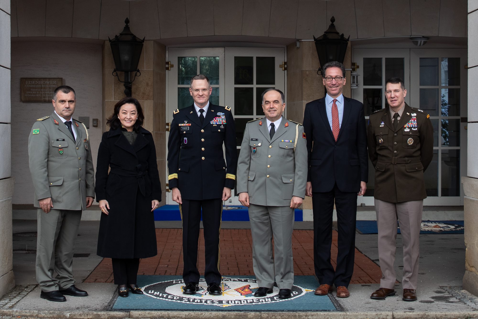 Pictured (left to right) in front of the USEUCOM headquarters building are Brig. Gen. Arben Kingji, Albania Land Forces Commander; Ambassador Yuri Kim, U.S. Ambassador to Albania; U.S. Army Lt. Gen. Michael Howard, USEUCOM Deputy Commander; Maj. Gen. Bajram Begaj, Chief of the General Staff, Albanian Armed Forces; Ambassador Adam Sterling, USEUCOM Foreign Policy Adviser; and U.S. Army Maj. Gen. Charles Miller, USEUCOM Director of Plans, Policy, Strategy, and Capabilities.