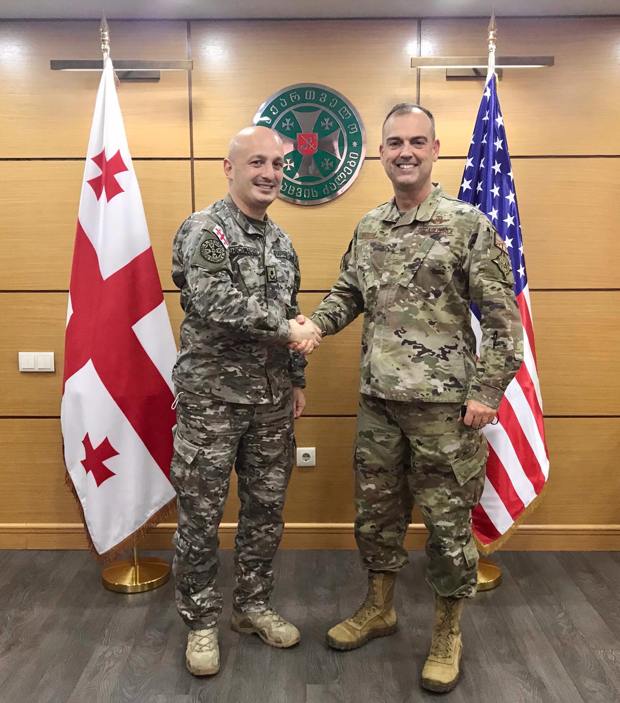 Brig. Gen. Edward Vaughan meets with his Georgian counterpart Brig. Gen. Irakli Tchitchinadze