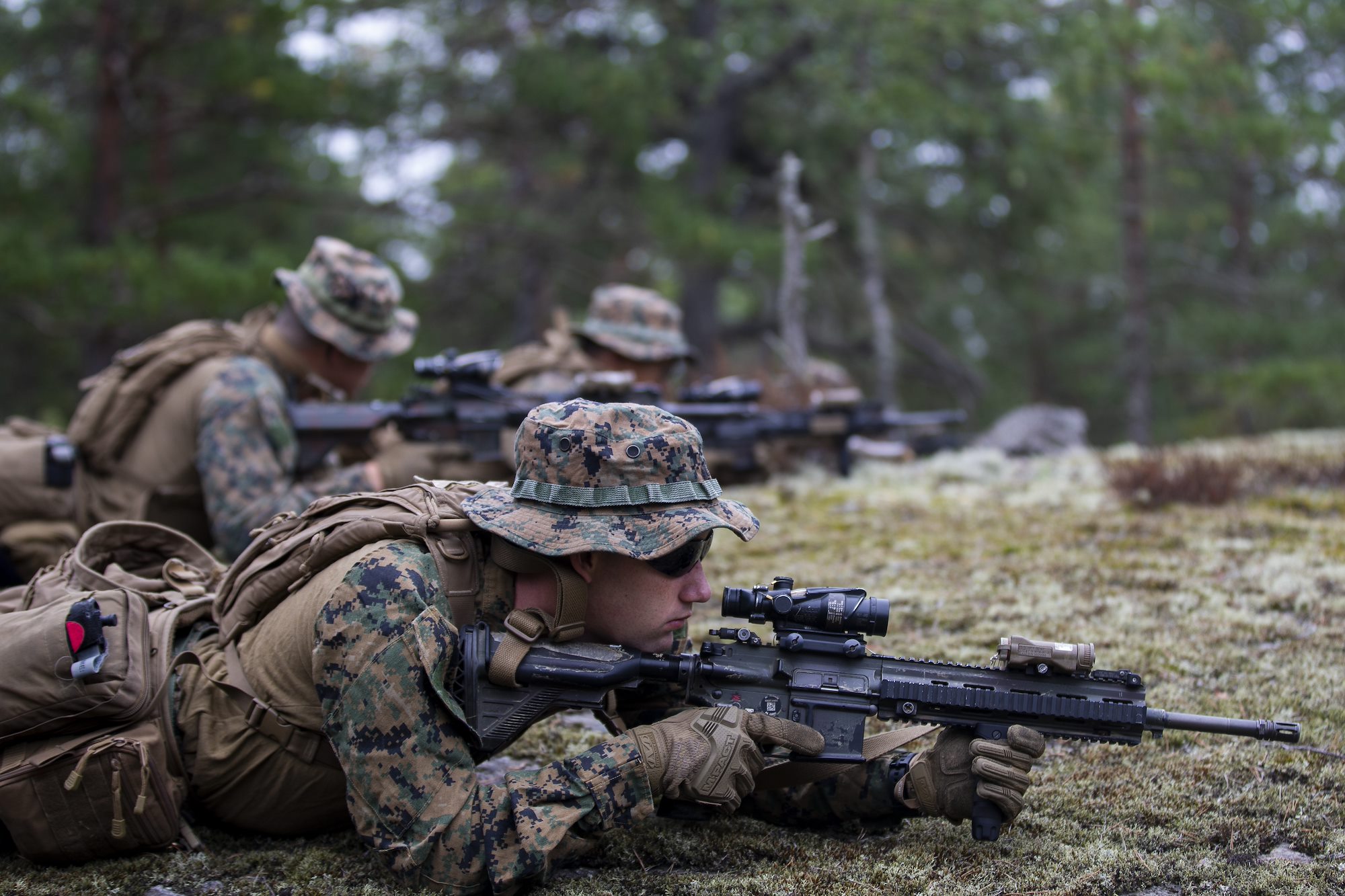 U.S. Marines with 1st Battalion, 6th Marine Regiment, 2d Marine Division, hold a support position during Exercise Archipelago Endeavor, on Berga Naval Base, Sweden, Sept. 11, 2021. Exercise Archipelago Endeavor is a multi-domain, field training exercise that focuses on regional engagements by conducting partnered, maritime raids and military-to-military collaboration, which strengthens operational capabilities and strategic cooperation between the U.S. Marine Corps and Swedish Armed Forces. (U.S. Marine Corps photo by 1st Lt. Paul Ortiz)