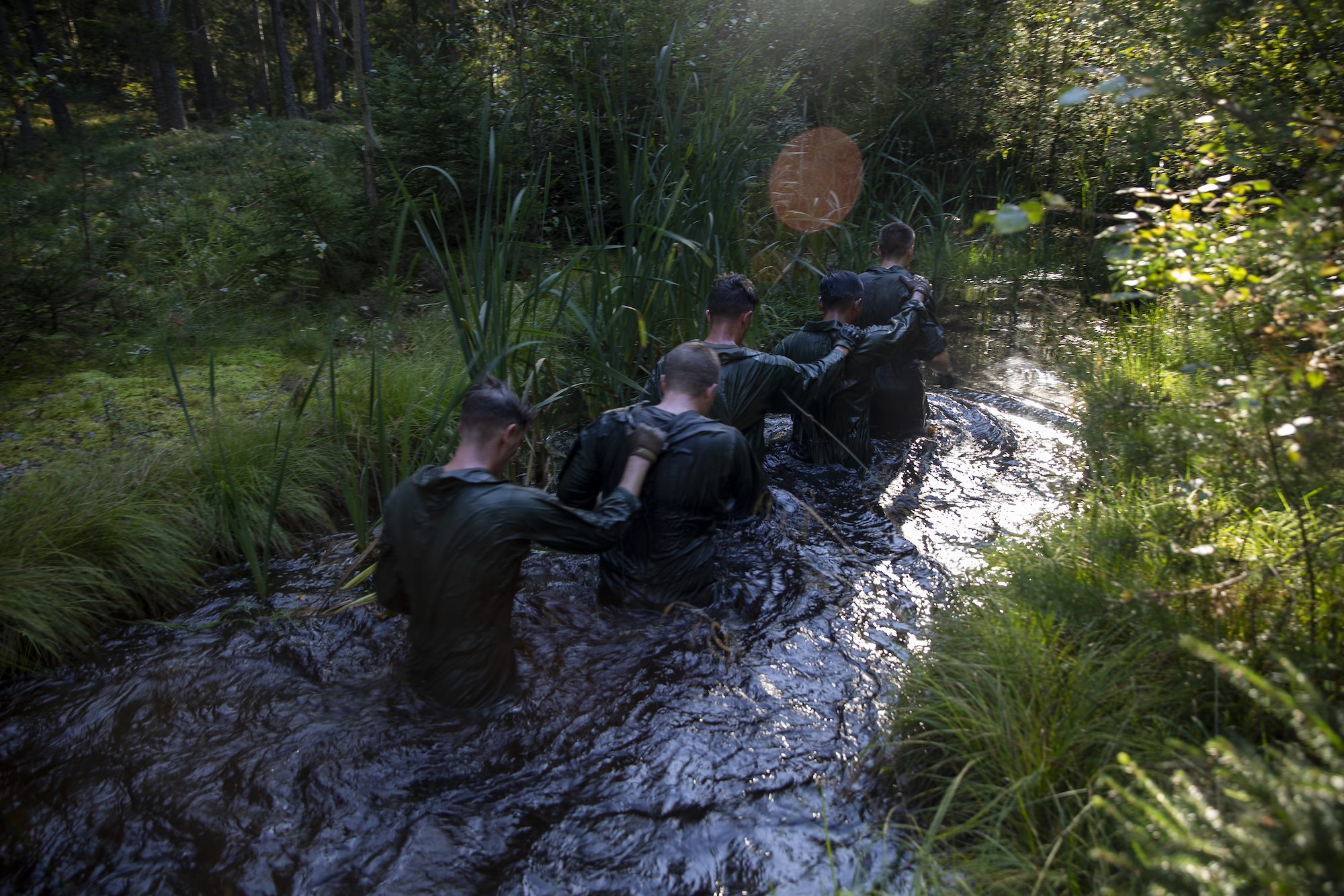 U.S. Marines with 1st Battalion, 6th Marine Regiment, 2d Marine Division, and Swedish Marines with the 204th Rifle Company, 2nd Marine Battalion, 1st Swedish Marine Regiment, maneuver through water as part of an obstacle course during Exercise Archipelago Endeavor on Berga Naval Base, Sweden, Sept. 14, 2021. Exercise Archipelago Endeavor is a multi-domain, field training exercise that focuses on regional engagements by conducting partnered, limited-scale maritime raids, and military-to-military collaboration and strengthens operational capabilities and strategic cooperation between the U.S. Marine Corps and Swedish Armed Forces. (U.S. Marine Corps photo by Pfc. Sarah Pysher)