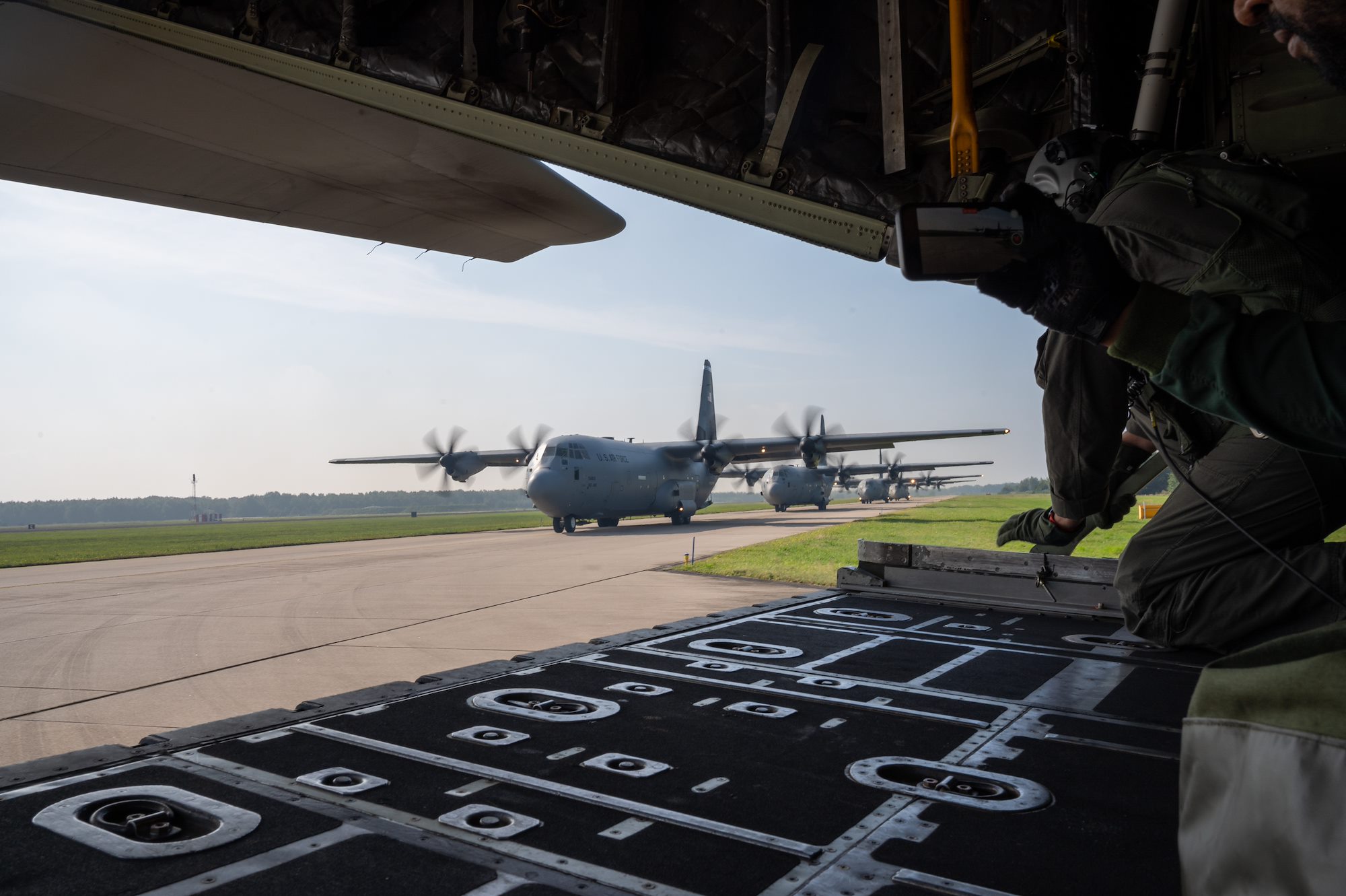 Allied aircraft taxi along the runway at Eindhoven Airport, Netherlands, ahead of taking off to drop parajumpers for Falcon Leap 2021, Sept. 17, 2021. A multinational parachute exercise, Falcon Leap demonstrates the U.S.’s commitment to NATO allies who they have served alongside since World War II. (U.S. Air Force photo by Senior Airman Branden Rae)