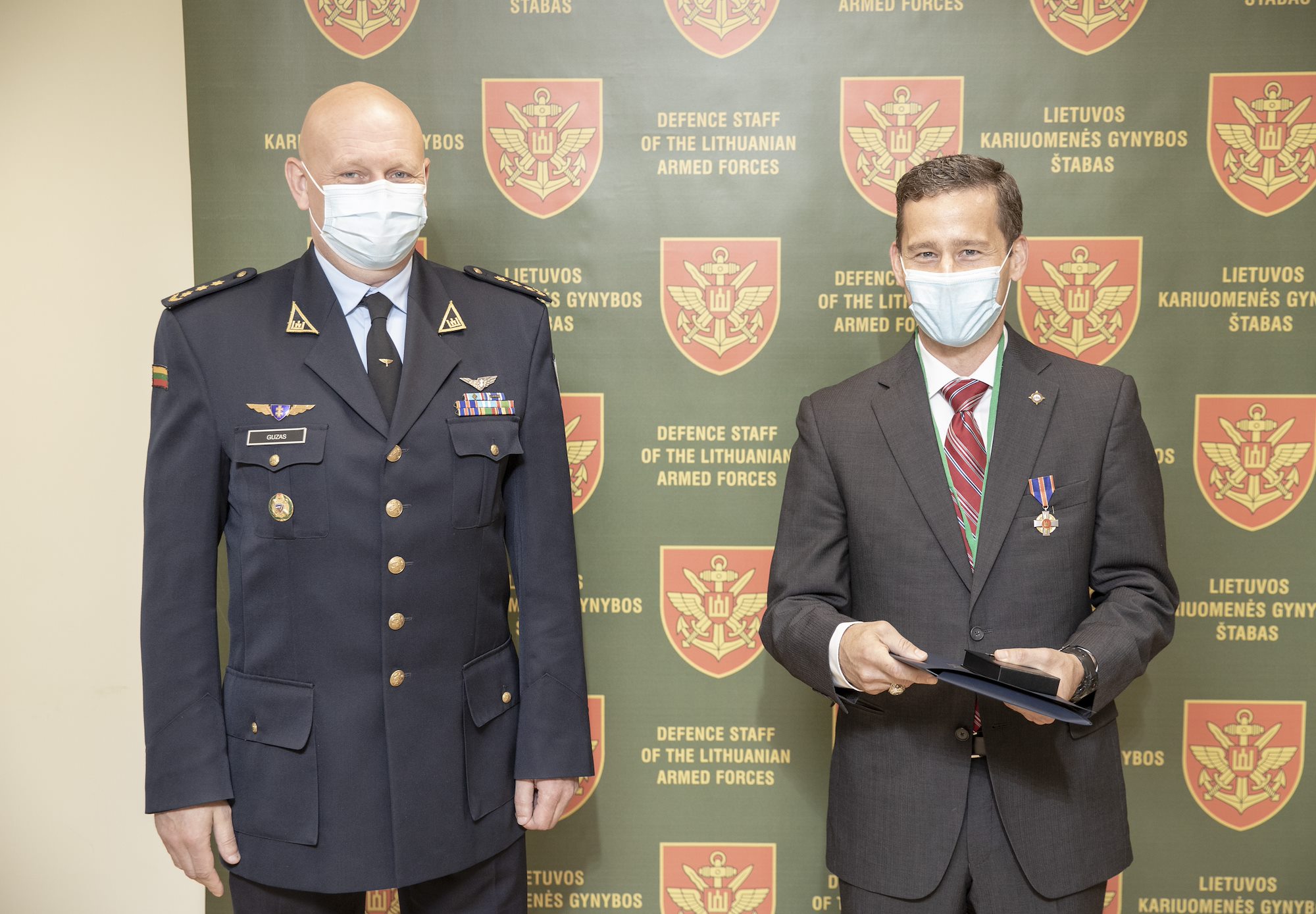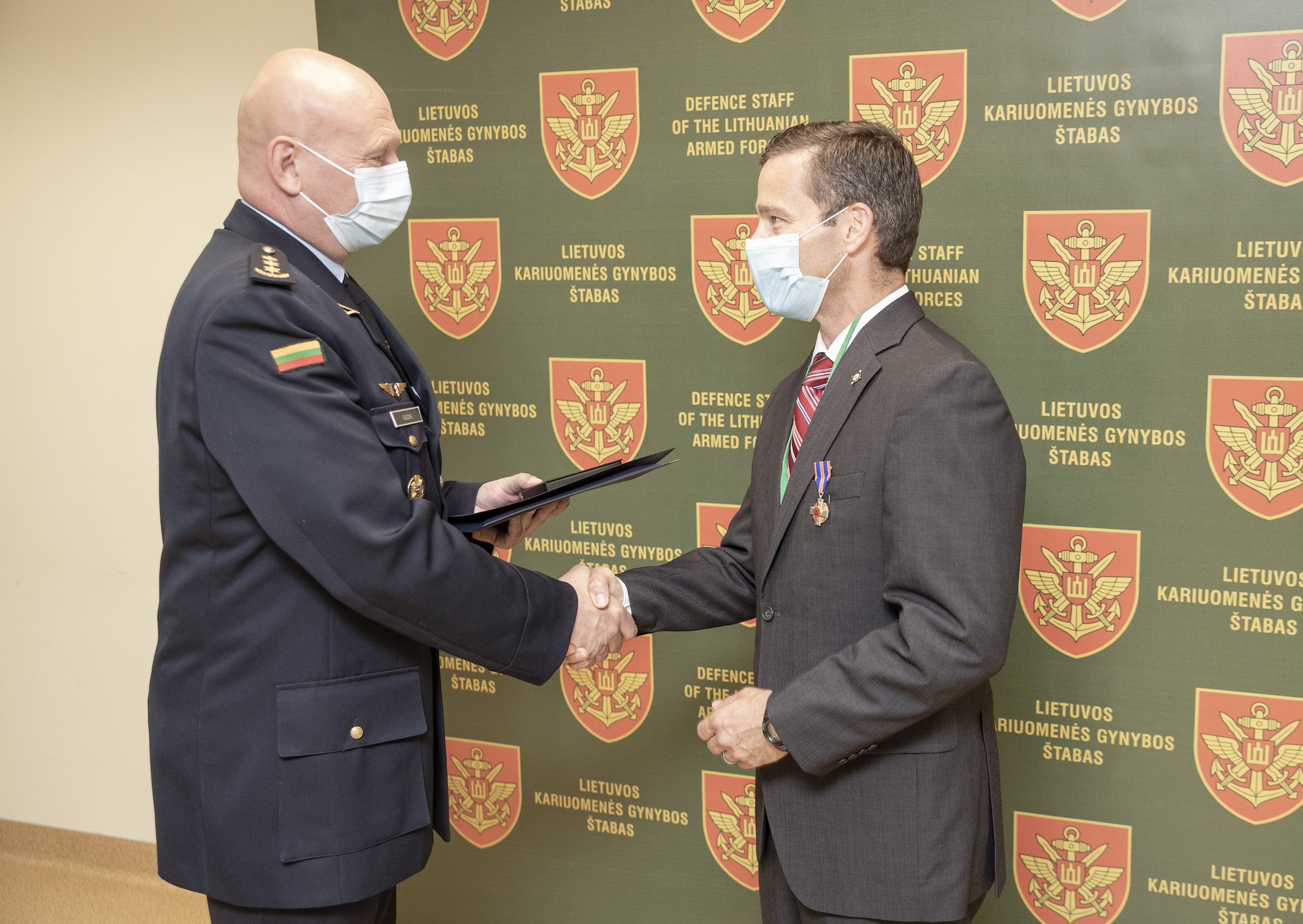 U.S. Navy Commander John Anthony "Tony" Campigotto, right, holds the citation that accompanies the medal pinned to his lapel. Lithuanian Air Force Commander Colonel Dainius Guzas, left, presented Campigotto with the Lithuanian Armed Forces Medal of Distinction during a ceremony held in Vilnius, Lithuania on June 14, 2021.