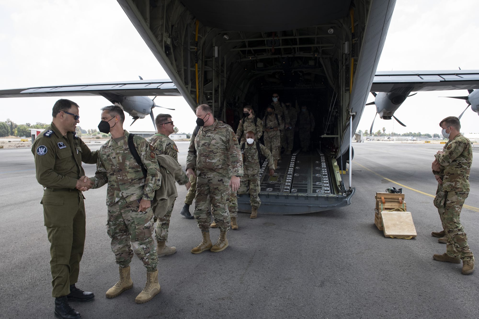 U.S. Air Force Lt. Gen. Steven Basham, U.S. Air Forces in Europe and Air Forces Africa deputy commander and Joint Task Force - Israel commander, and other U.S. Air Force members are greeted by Israel Defense Forces Col. Gershon Zlotnik, Israeli Task Force deputy commander, upon arrival in Israel to participate in Juniper Falcon 2021-2, July 23, 2021. Despite the challenges presented by COVID-19, both the U.S. and Israel are focused on building readiness in support of the United States’ ironclad commitment to assist in the defense of Israel and are committed to the safety of our personnel, their families and the communities where activities are taking place. In accordance with host nation guidance, newly arriving personnel were required to wear facial masks, receive COVID-19 tests and proceed to isolation.