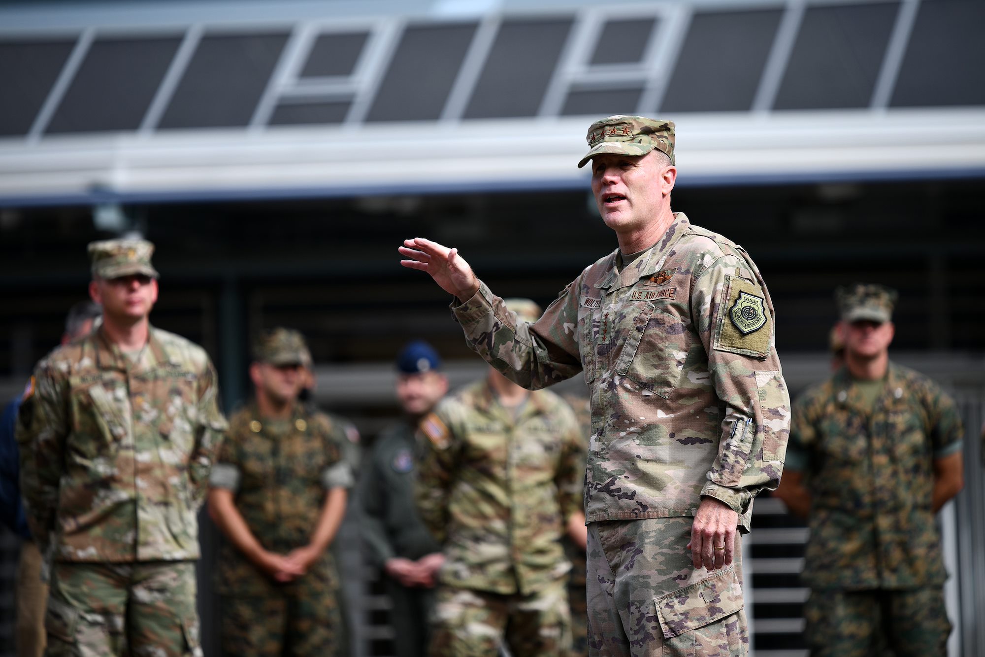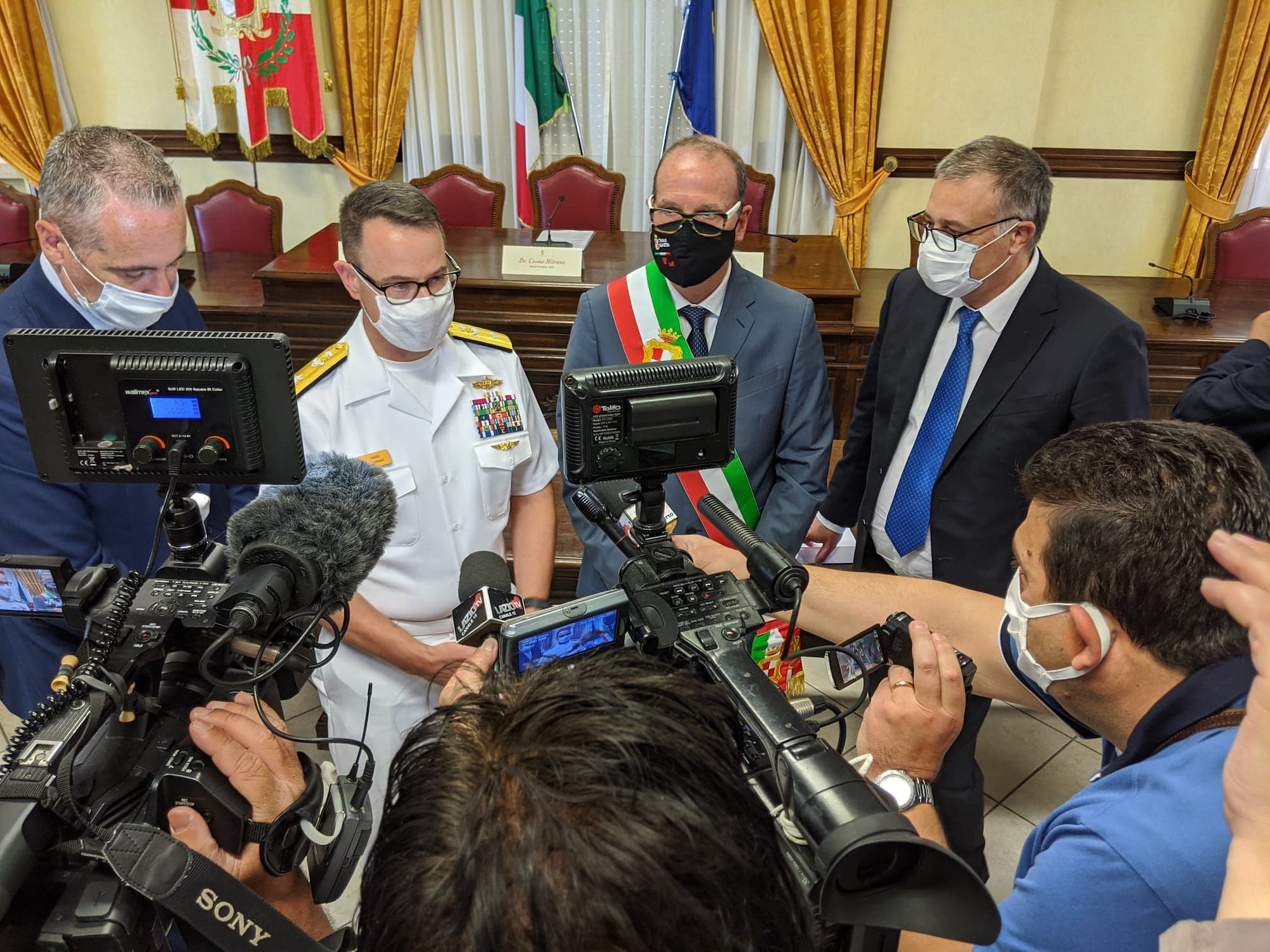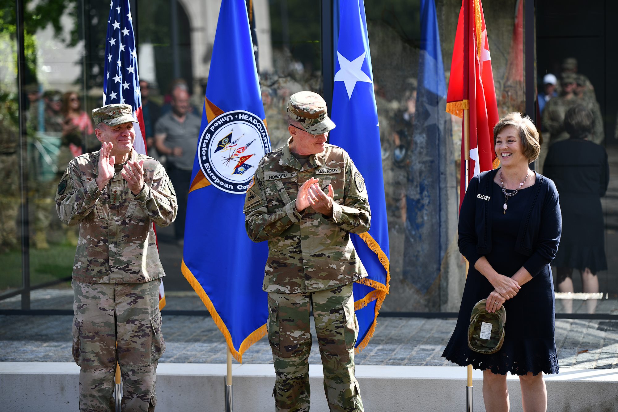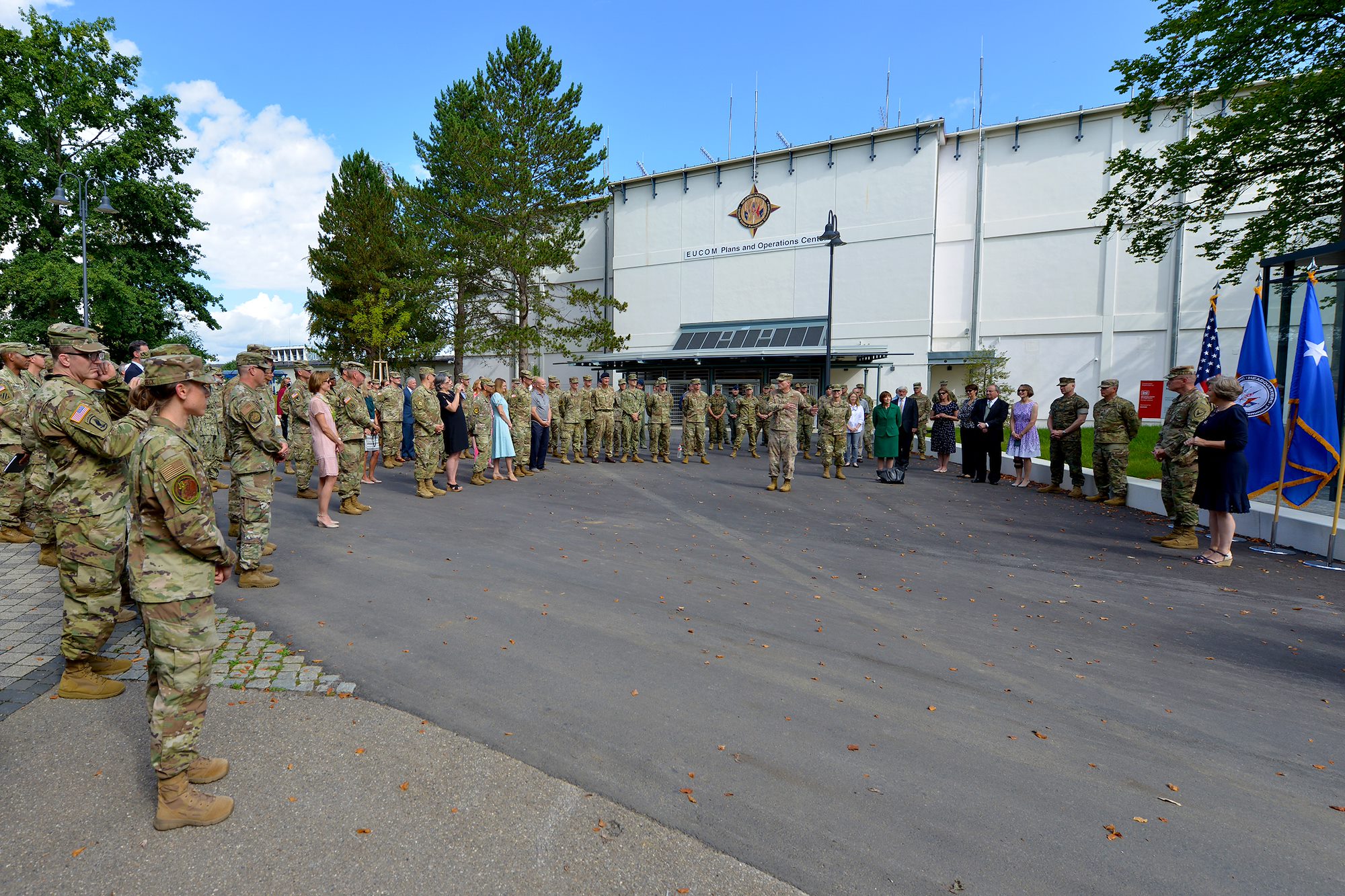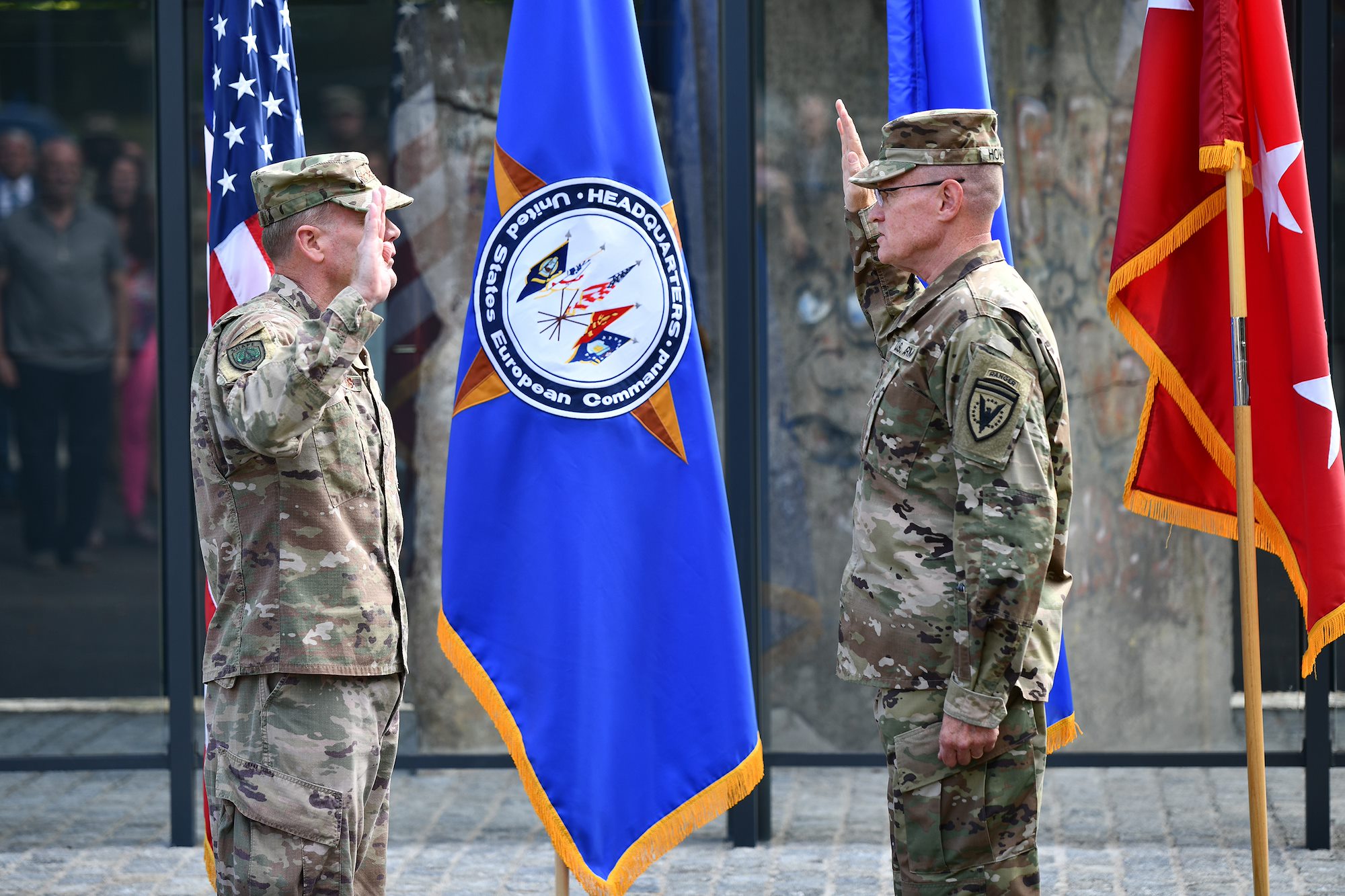 200717-N-NO090-1002 NAPLES, Italy (July 17, 2020) Adm. Robert P. Burke, Gen. Tod D. Wolters, commander, U.S. European Command and Supreme Allied Commander Europe, and Adm. James G. Foggo III, commander, U.S. Naval Forces Europe-Africa and commander, Allied Joint Force Command-Naples, salute the colors during the U.S. Naval Forces Europe-Africa, Allied Joint Force Command change of command ceremony. Adm. Foggo was relieved by Adm. Robert P. Burke at Allied Joint Force Command (JFC) Naples, Italy, July 17, 2020. U.S. Naval Forces Europe-Africa, headquartered in Naples, Italy, conducts the full spectrum of joint and naval operations, often in concert with allied and interagency partners, in order to advance U.S. national interests and security and stability in Europe and Africa. (Photo courtesy of JFC Public Affairs, German Airforce Master Sergeant Florian Fergen)