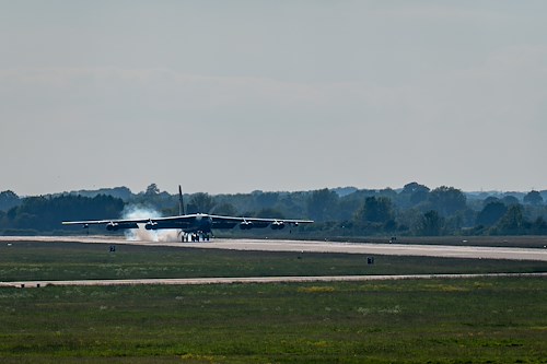 A U.S. Air Force B-52H Stratofortress, assigned to the 69th Expeditionary Bomb Squadron lands at Royal Air Force Base Fairford, England May 20, 2024. The ability to forward posture strategic bombers within the European theater enables critical touchpoints with NATO Allies and partners to advance the ability to operate as a single, cohesive force. (U.S. Air Force photo by Airman 1st Class Jared Brewer)