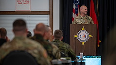 U.S. Air Force Lt. Gen. Steven Basham, U.S. European Command deputy commander, speaks with members of the European Strategy Conference and Workshop at Ramstein Air Base, Germany, on Feb. 1, 2024. Nearly 750 military and civilian leaders from more than 30 Allied and partner nations took part in the event to discuss the impacts of malign influence in the Euro-Atlantic, and considerations to implement and execute NATOS’s regional plans to enhance European security and stability.