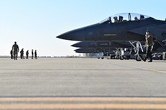 U.S. Airmen from the 336th Fighter Squadron, 4th Fighter Wing, Seymour Johnson Air Force Base, North Carolina, prepare their F-15E Strike Eagles for a series of training sorties conducted under Operation Castle Forge, alongside allies from the Hellenic Air Force’s 110th Combat Wing at Larissa Air Base, Greece, Oct. 11, 2021. The 110th Combat Wing flies the F-16 aircraft.