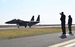 Maintenance personnel from the Romanian Air Force's 53rd Fighter Squadron bid farewell to F-15E Strike Eagle aircrews from the 336th Fighter Squadron, 4th Fighter Wing, Seymour Johnson Air Force Base, North Carolina at the conclusion of Castle Forge's first forward deployment phase to exercise and demonstrate Agile Combat Employment capabilities at Borcea 86th Air Base, Romania, Oct. 22, 2021.
