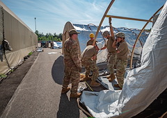 U.S. Air Force Airmen assigned to the 435th Construction Training Squadron assemble pods at Ramstein Air Base, Germany, Aug. 25, 2021. The 435th CTS, with the help of Dutch and Romanian military forces, are supporting Operation Allies Refuge by assembling pods for evacuees to stay in until they continue to other transient locations. (U.S. Air Force photo by Airman Jared Lovett)