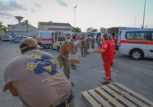 210830-N-PJ626-0046 NAVAL AIR STATION SIGONELLA, Italy (Aug. 30, 2021) – Volunteers from the American and Italian Red Cross prepare donations for evacuees from Afghanistan on Naval Air Station (NAS) Sigonella, Aug. 30, 2021. NAS Sigonella is currently supporting the Department of State mission to facilitate the safe departure and relocation of U.S. citizens, Special Immigration Visa recipients, and vulnerable populations from Afghanistan. (U.S. Navy photo by Mass Communication Specialist 2nd Class Kaila V. Peters)