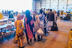 NAVAL STATION ROTA, Spain (Aug. 30, 2021) Evacuees from Afghanistan wait to check in with U.S. Naval Hospital (USNH) Rota personnel after their arrival at Naval Station (NAVSTA) Rota Aug. 30, 2021. NAVSTA Rota is currently supporting the Department of State mission to facilitate the safe departure and relocation of U.S. citizens, Special Immigration Visa recipients, and vulnerable populations from Afghanistan. (U.S. Navy photo by Mass Communication Specialist 1st Class Nathan Carpenter)