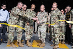 U.S. Army Gen. Christopher Cavoli, Commander, U.S. European Command & Supreme Allied Commander, and U.S. Army Maj. Gen. Andrew Gainey, Commander, U.S. Army Southern European Task Force, and U.S. Air Force Brig. Gen. Tad Clark, 31st Fighter Wing commander, cut the ribbon of a new Army warehouse at Aviano Air Base, Italy, Oct. 9, 2024 The warehouse project has been a top U.S. Army and USEUCOM priority, as it will reduce 173rd Airborne Brigade response time for contingency missions in Europe, Africa and the Middle East.