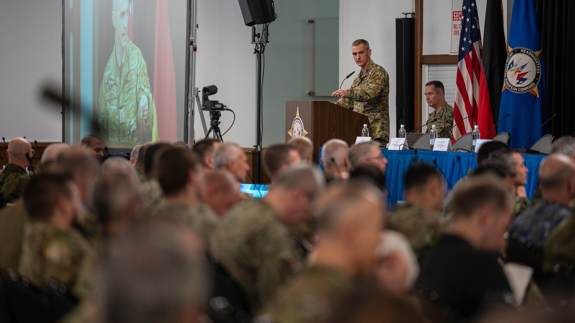 U.S. Air Force Lt. Gen. Steven Basham, U.S. European Command deputy commander, speaks with members of the European Strategy Conference and Workshop at Ramstein Air Base, Germany, on Feb. 1, 2024. Nearly 750 military and civilian leaders from more than 30 Allied and partner nations took part in the event to discuss the impacts of malign influence in the Euro-Atlantic, and considerations to implement and execute NATOS’s regional plans to enhance European security and stability.