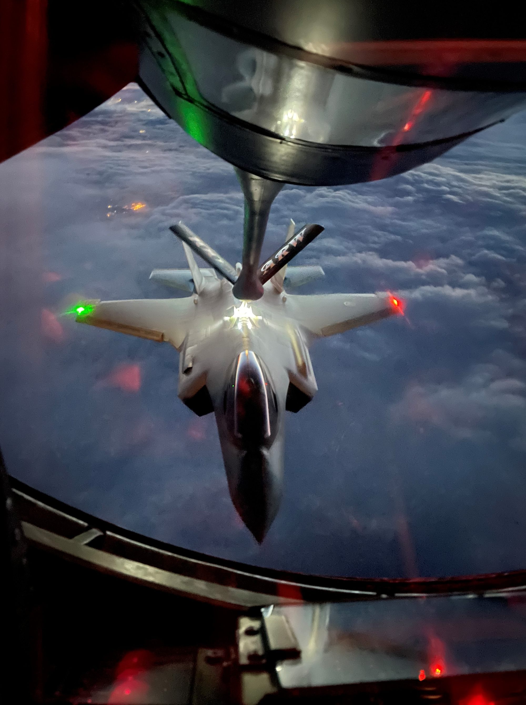 A Norwegian air force F-35A Lighting II aircraft receives fuel from a U.S. Air Force KC-135 Stratotanker aircraft assigned to the 100th Air Refueling Wing, Royal Air Force Mildenhall, England, during exercise Castle Forge over Norway, Nov. 4, 2021. Training with joint and combined allies and partners increases lethality and enhances interoperability, allowing U.S. forces to counter military aggression and coercion by sharing responsibilities for common defense. In addition to F-15 Eagle aircraft operations in the Black Sea Region, Castle Forge encompasses the USAFE-wide Agile Combat Employment capstone event. Castle Forge’s components will better enable forces to quickly disperse and continue to deliver air power from locations with varying levels of capacity and support, ensuring Airmen are always ready to respond to potential threats. (U.S. Air Force photo by Senior Airman Joseph Barron)