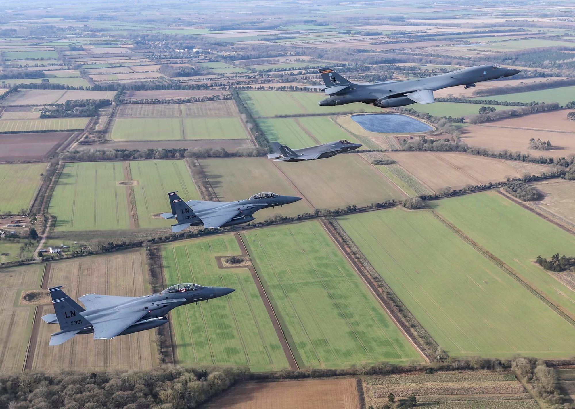 Air Force Global Strike Command strategic bombers were joined by Royal Air Force F-35 aircraft and U.S. Air Force F-15 aircraft from RAF Lakenheath over the RAF Duxford area. Duxford houses Europe’s largest air museum and was once home to an Eighth Air Force P-51 unit.