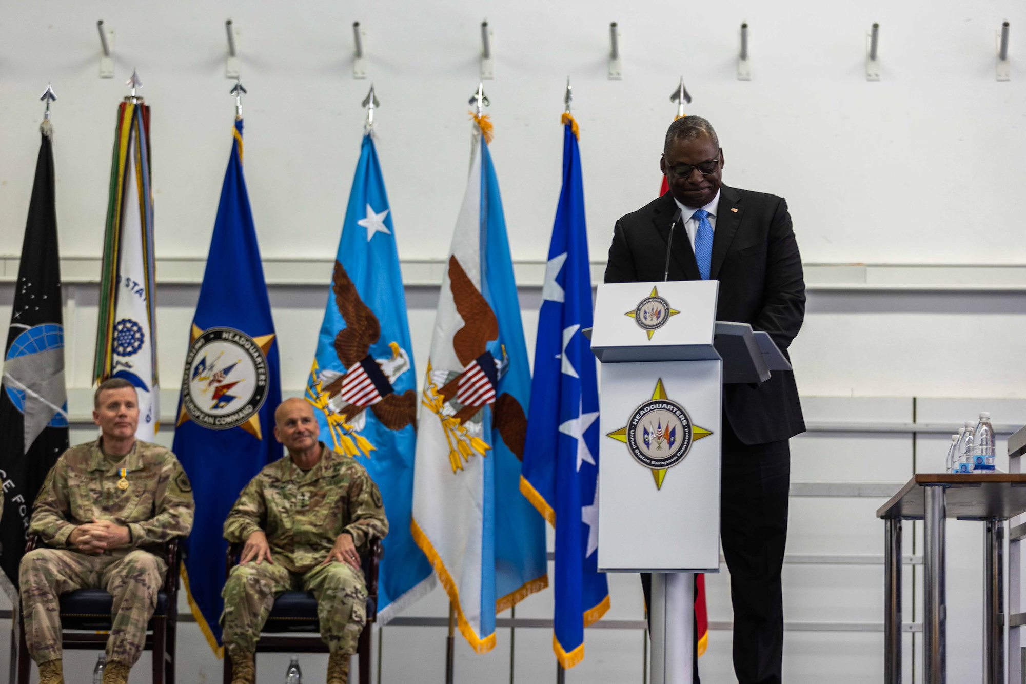 U.S. Secretary of Defense Lloyd J. Austin III gives his remarks during a change of command ceremony for U.S. European Command in Stuttgart, Germany, on July 1, 2022. Upon taking command from U.S. Air Force Gen. Tod D. Wolters, U.S. Army Gen. Christopher G. Cavoli assumed responsibility for U.S. military operations across Europe, portions of Asia and the Middle East, the Arctic and Atlantic Ocean. USEUCOM is comprised of more than 64,000 permanently assigned military and civilian personnel and works closely with NATO Allies