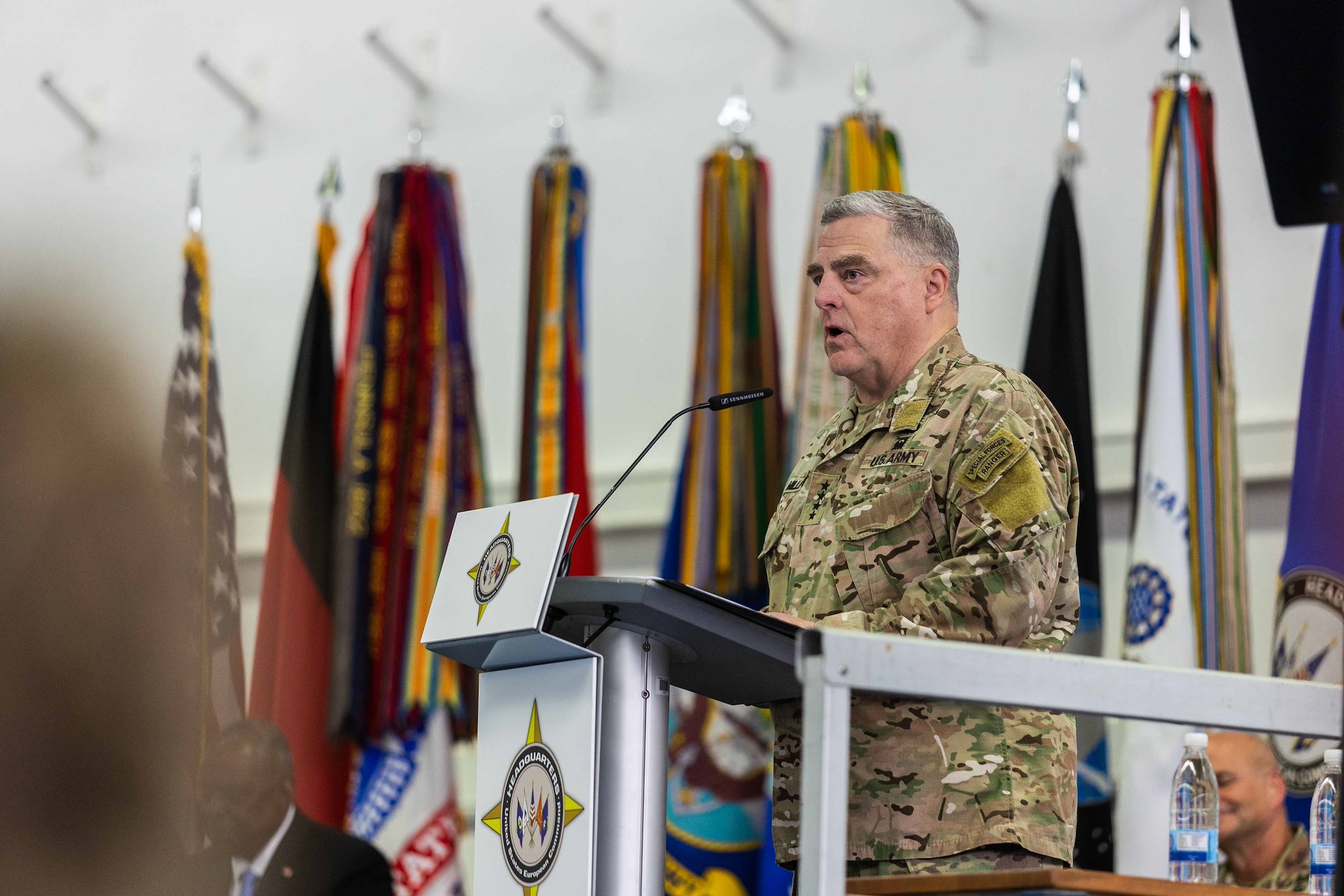 U.S. Chairman of the Joint Chiefs of Staff General Mark A. Milley, gives his opening remarks during a change of command ceremony for U.S. European Command in Stuttgart, Germany, on July 1, 2022. Upon taking command from U.S. Air Force Gen. Tod D. Wolters, U.S. Army Gen. Christopher G. Cavoli assumed responsibility for U.S. military operations across Europe, portions of Asia and the Middle East, the Arctic and Atlantic Ocean. USEUCOM is comprised of more than 64,000 permanently assigned military and civilian personnel and works closely with NATO Allies and Partners. (U.S. Army Photo By Sgt. Patrik Orcutt)