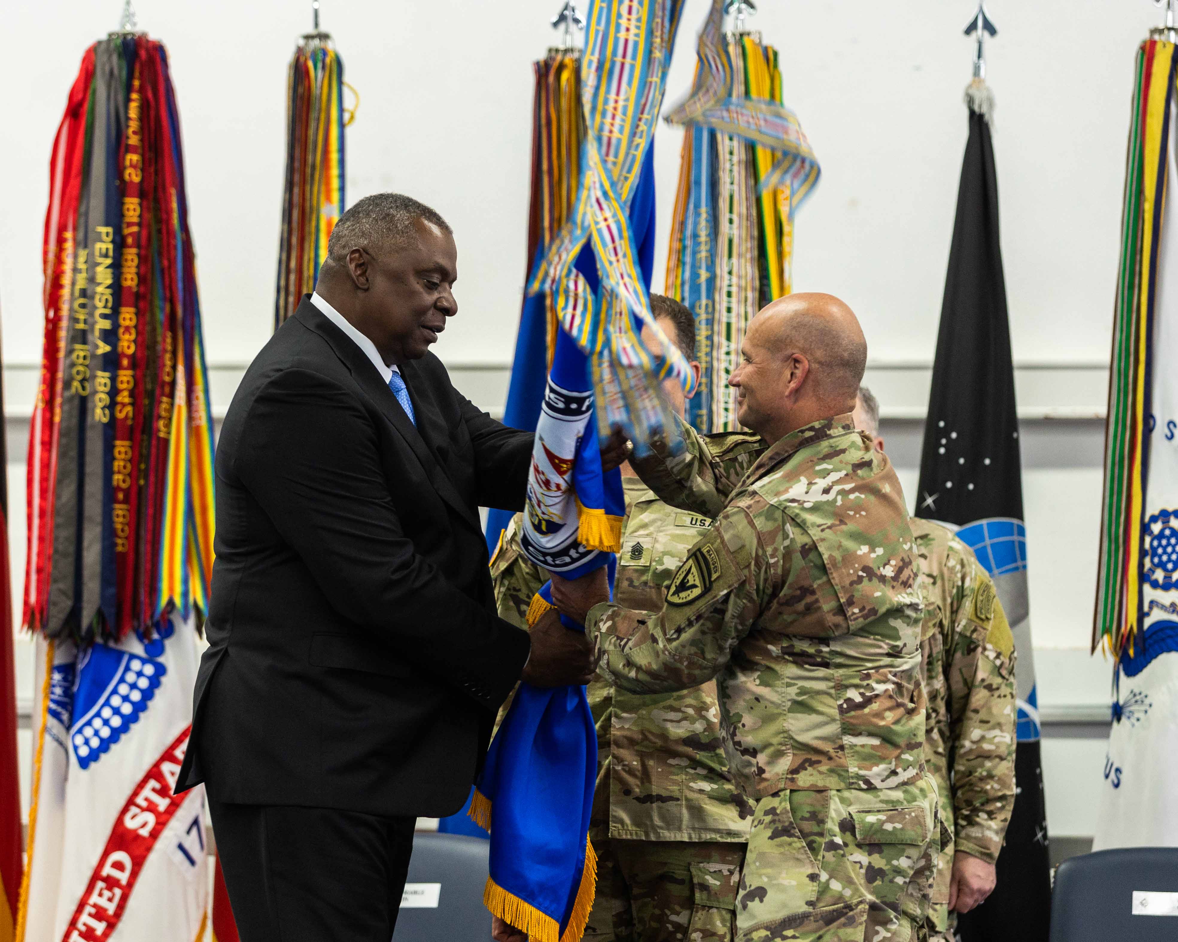 U.S. Secretary of Defense Lloyd J. Austin III hands the EUCOM guidon to U.S. Army Gen. Christopher G. Cavoli, during a change of command ceremony for U.S. European Command in Stuttgart, Germany, on July 1, 2022. Upon taking command from U.S. Air Force Gen. Tod D. Wolters, Cavoli assumed responsibility for U.S. military operations across Europe, portions of Asia and the Middle East, the Arctic and Atlantic Ocean. USEUCOM is comprised of more than 64,000 permanently assigned military and civilian personnel and works closely with NATO Allies and Partners. (U.S. Army Photo By Sgt. Patrik Orcutt)