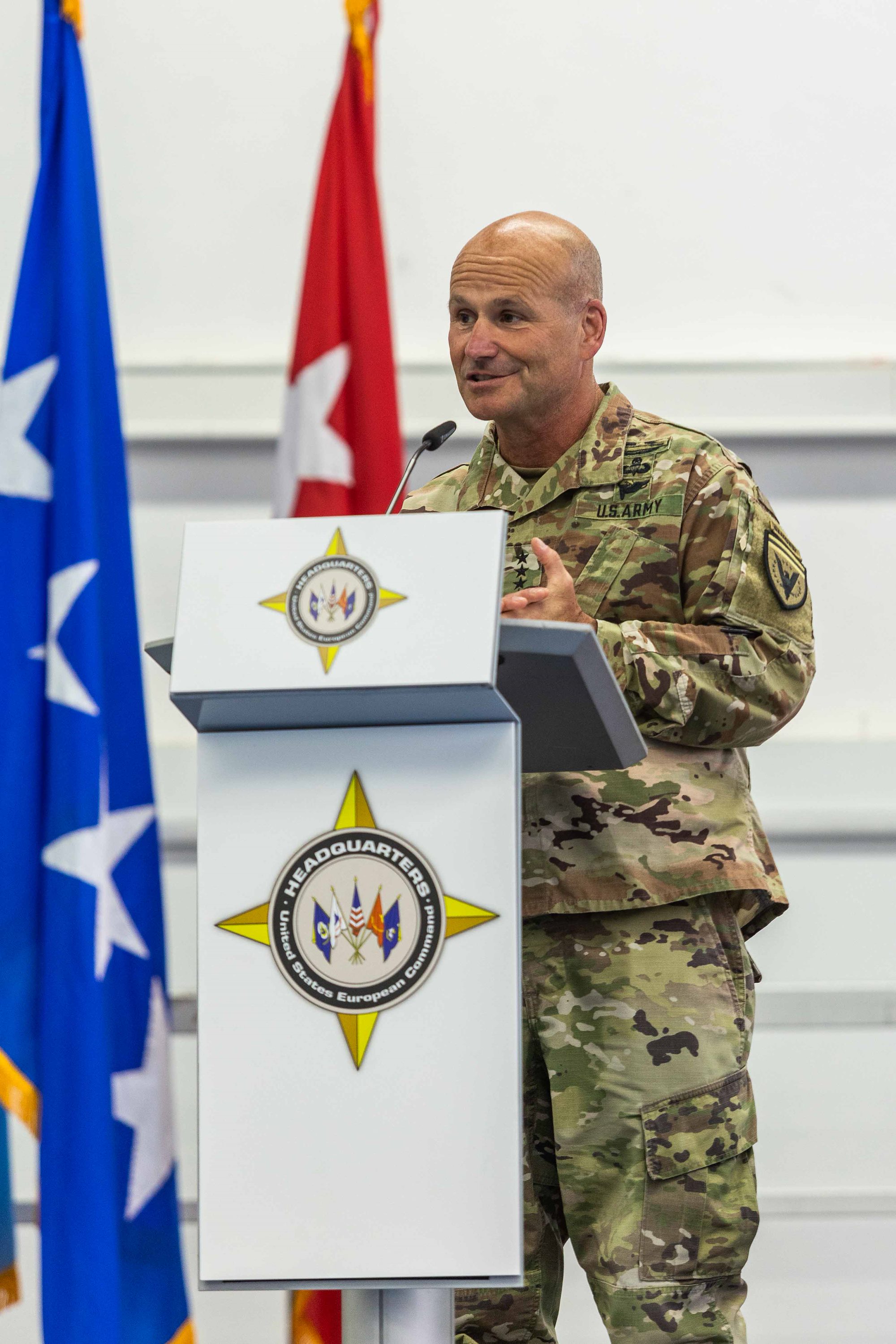 U.S. Army Gen. Christopher G. Cavoli gives his remarks during his change of command ceremony for U.S. European Command in Stuttgart, Germany, on July 1, 2022. Upon taking command from U.S. Air Force Gen. Tod D. Wolters, Cavoli assumed responsibility for U.S. military operations across Europe, portions of Asia and the Middle East, the Arctic and Atlantic Ocean. USEUCOM is comprised of more than 64,000 permanently assigned military and civilian personnel and works closely with NATO Allies and Partners. (U.S. Army Photo By Sgt. Patrik Orcutt)
