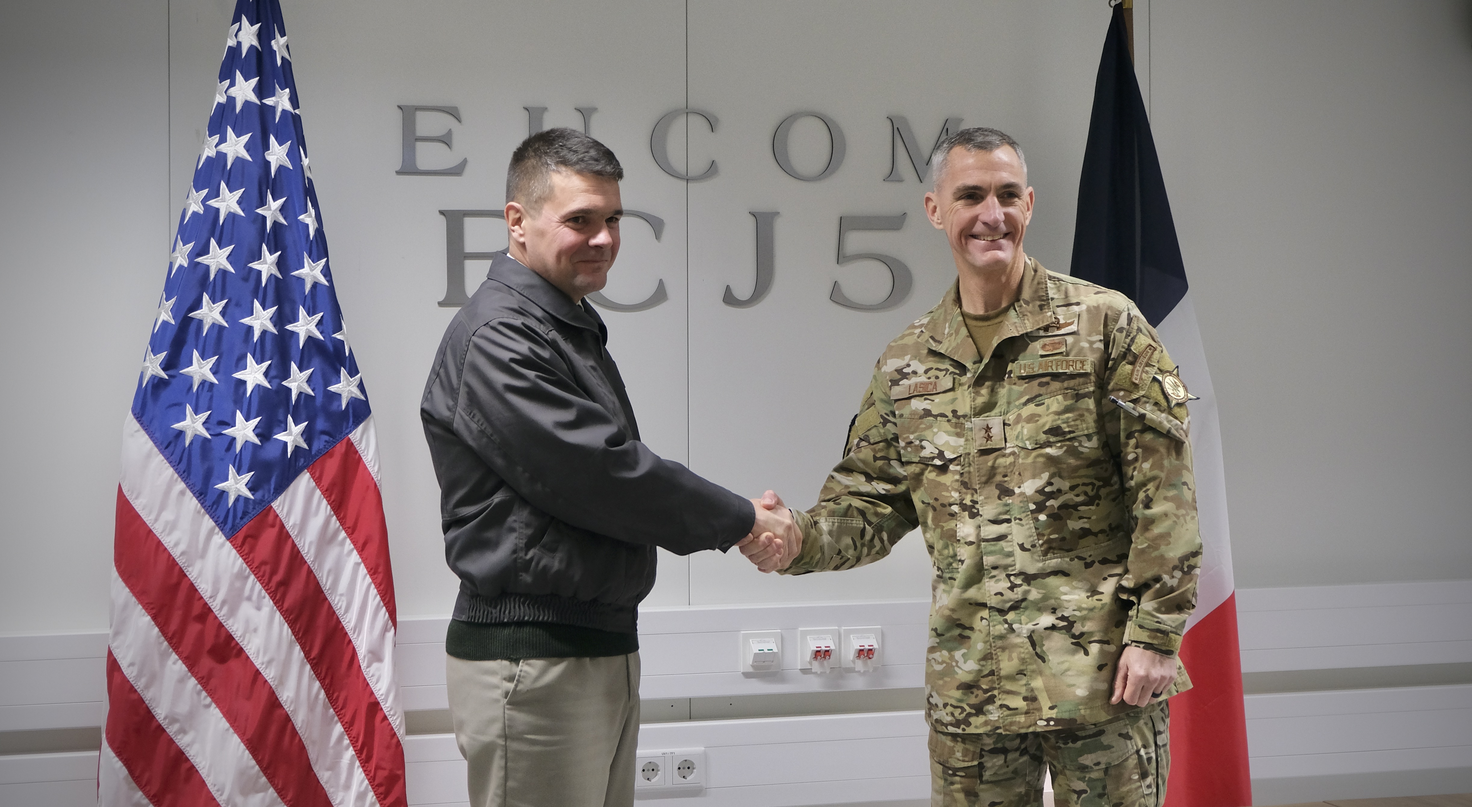 U.S. Air Force Maj. Gen. Daniel Lasica, director, U.S. European Command Strategy, Plans and Policy, hosted Maj. Gen. Philippe de Montenon, chief of the French Strategic Joint Operation Center, and a French military delegation to the command’s headquarters in Stuttgart, Germany, on Jan. 25, 2024.