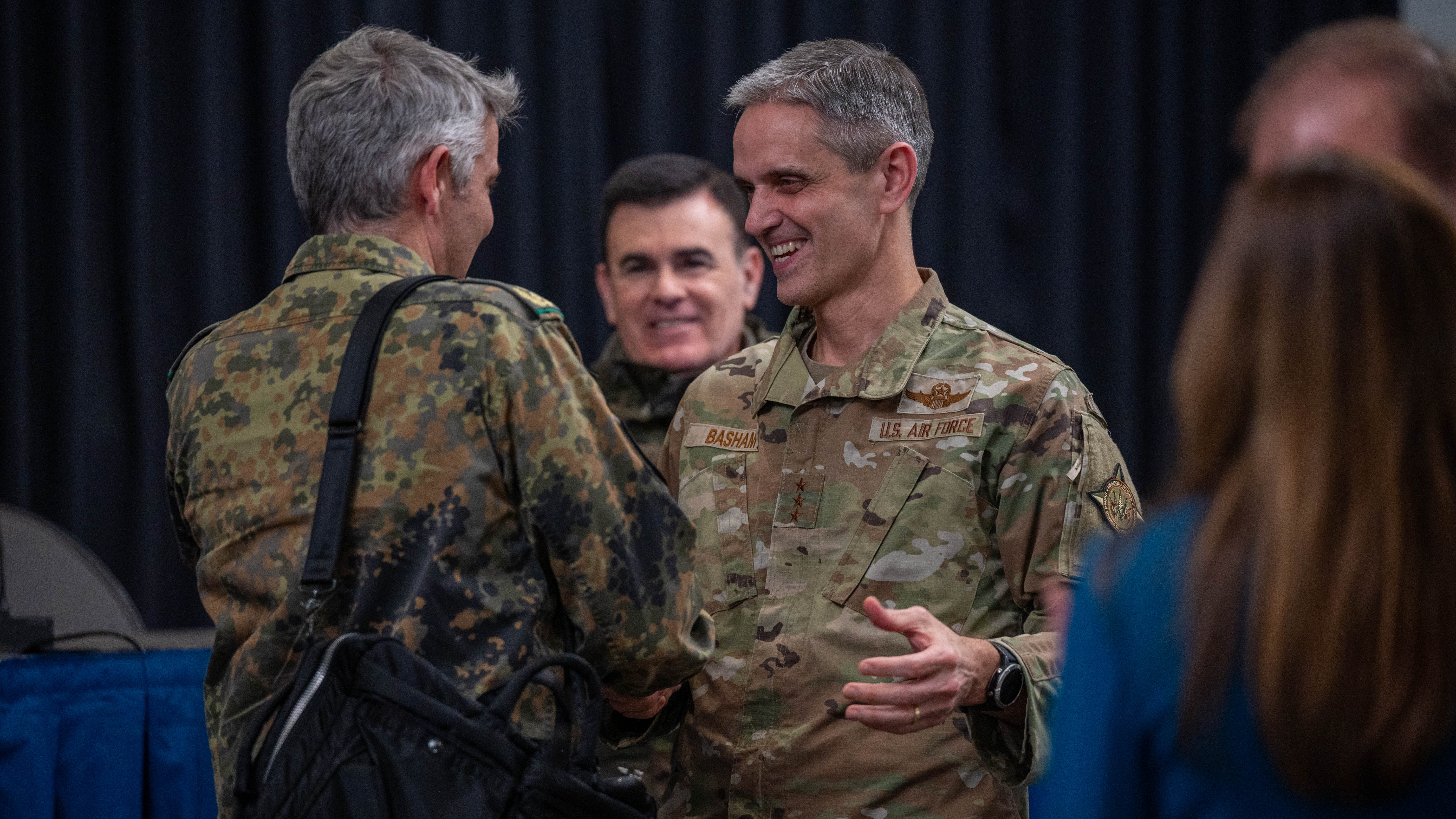 U.S. Air Force Lt. Gen. Steven Basham, U.S. European Command deputy commander, speaks with members of the European Strategy Conference and Workshop at Ramstein Air Base, Germany, on Feb. 1, 2024. Nearly 750 military and civilian leaders from more than 30 Allied and partner nations took part in the event to discuss the impacts of malign influence in the Euro-Atlantic, and considerations to implement and execute NATOS’s regional plans to enhance European security and stability.